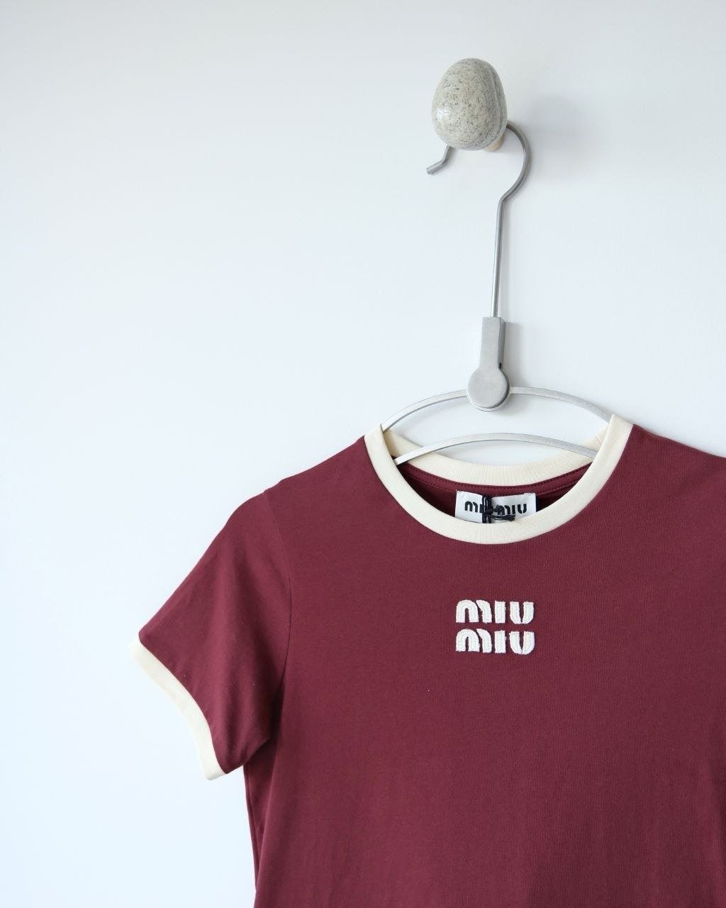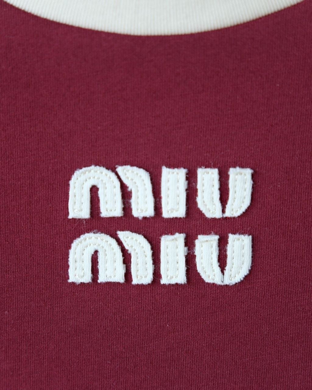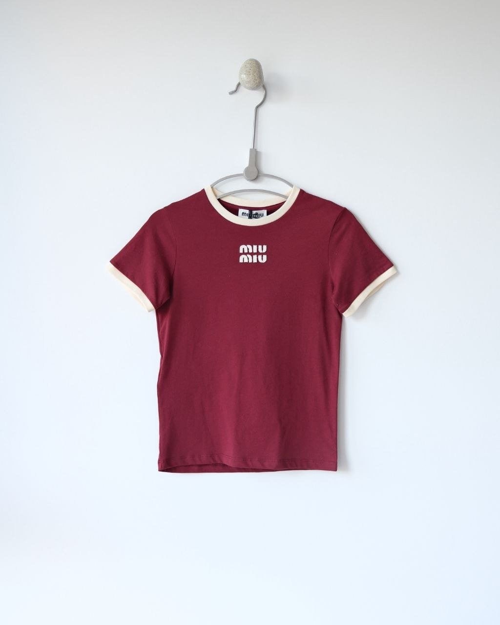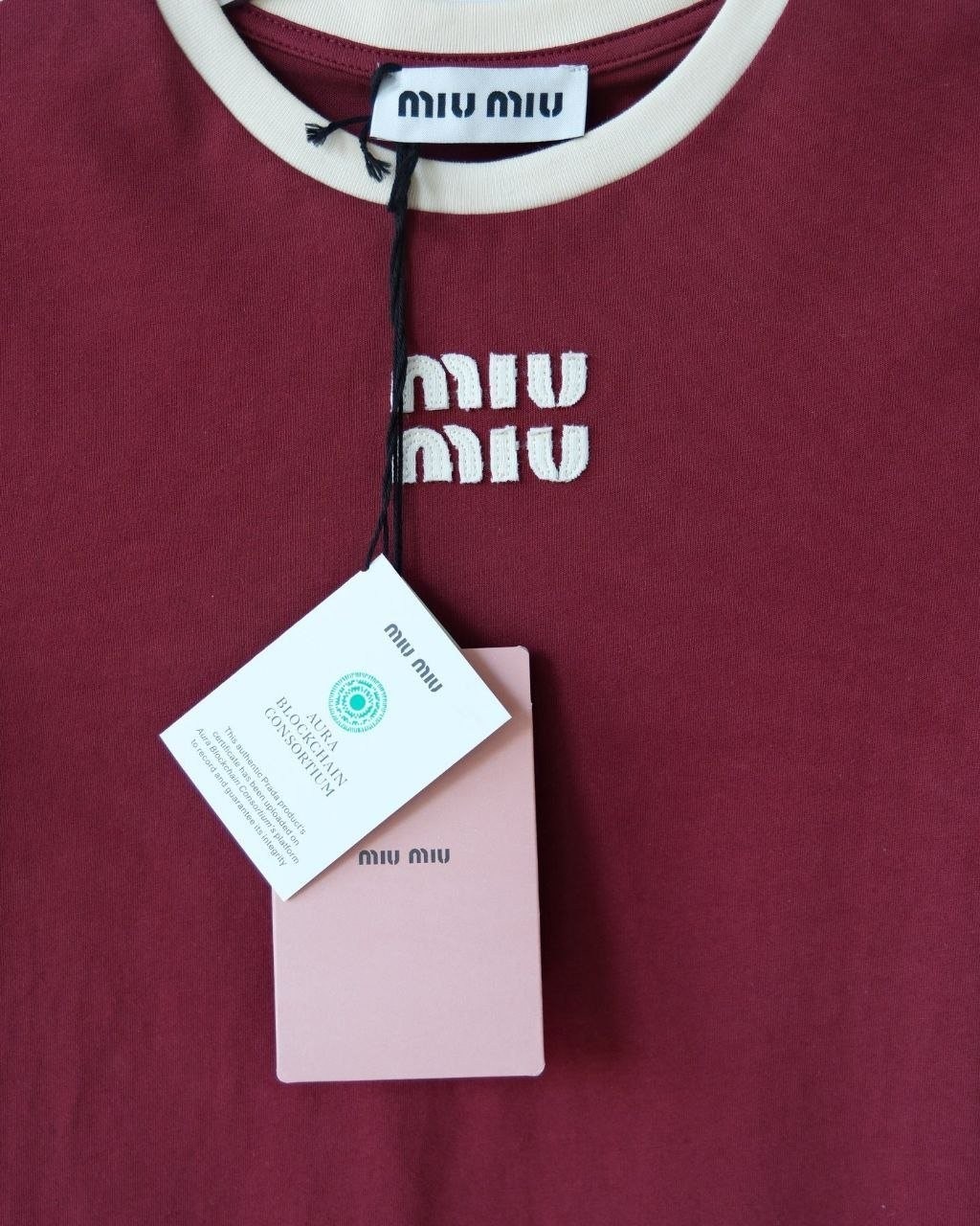 •(칩 탑재 최상급) MI* MI* SS26 로고 패치 자수 숏 슬리브 티셔츠 입니다. 매장 구매 후 제작, 원단과 동일 사양으로 제작된 제품입니다. 원단은 전면 원판 그대로 제직한 100% 면 평직(저지) 소재를 사용했으며, 넥의 와인 컬러 리브와 가슴의 MIU 자수 패치 원단은 모두 맞춤 염색 처리하여 색 차이가 전혀 없는 0색차 버전입니다. 가슴의 MIU 로고 패치는 레이저 컷팅으로 정교하게 제작한 후, 자수기로 가장자리 둘레를 따라 봉제하여 완성하였고 착용 시 까슬거림이 없으며 뒷면에 실밥이 남지 않도록 마감했습니다.