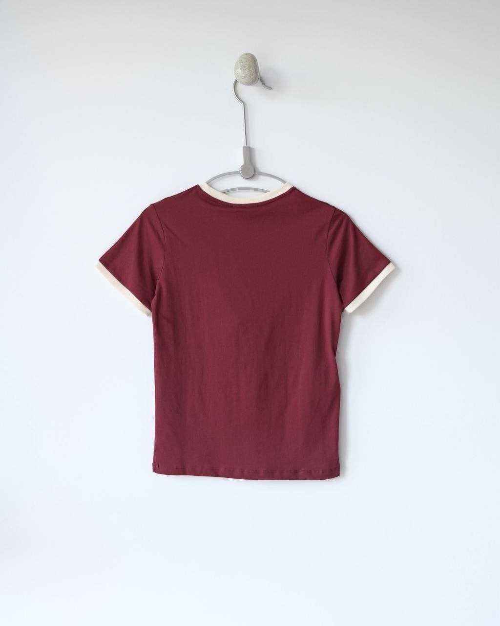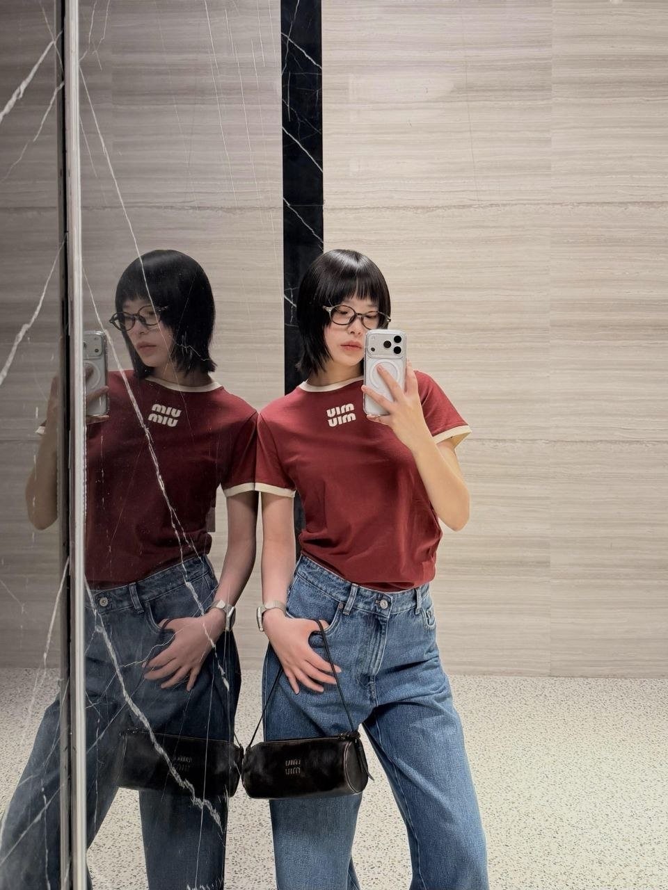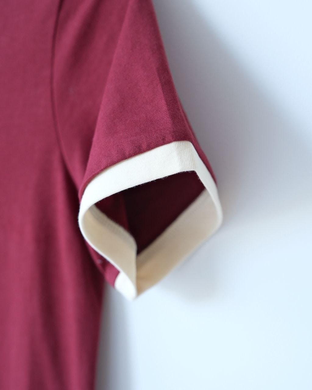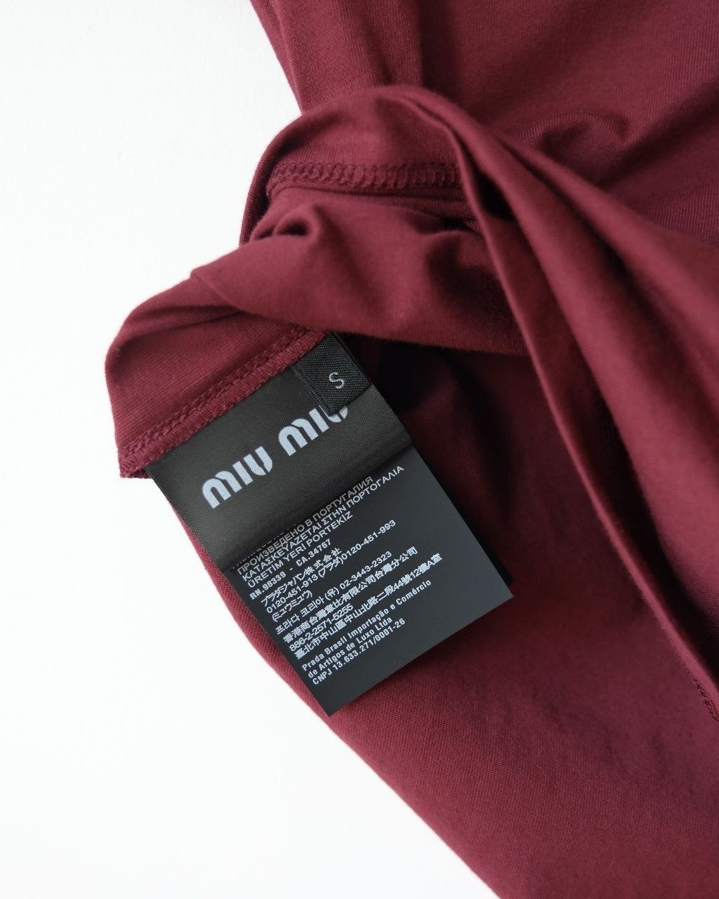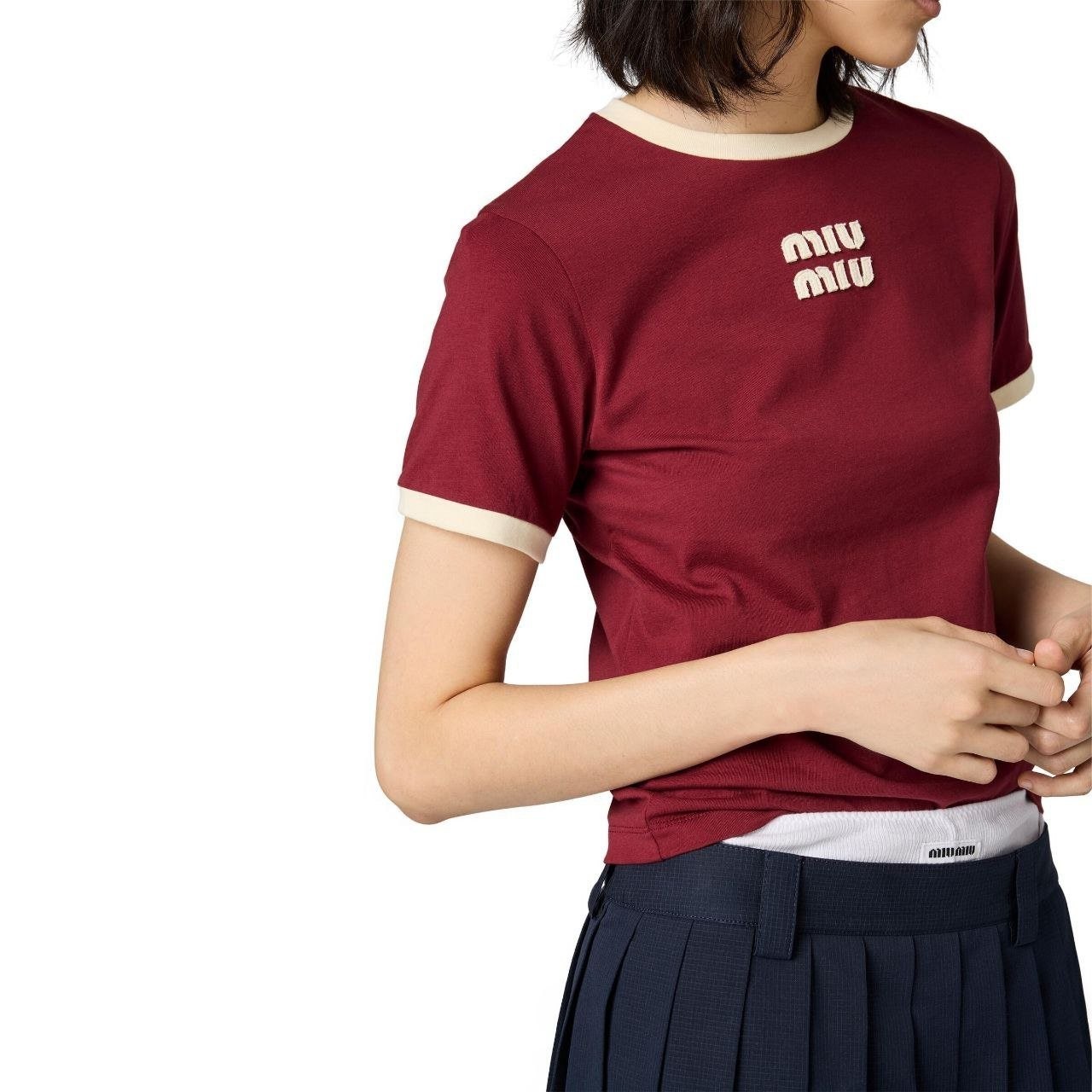 •(칩 탑재 최상급) MI* MI* SS26 로고 패치 자수 숏 슬리브 티셔츠 입니다. 매장 구매 후 제작, 원단과 동일 사양으로 제작된 제품입니다. 원단은 전면 원판 그대로 제직한 100% 면 평직(저지) 소재를 사용했으며, 넥의 와인 컬러 리브와 가슴의 MIU 자수 패치 원단은 모두 맞춤 염색 처리하여 색 차이가 전혀 없는 0색차 버전입니다. 가슴의 MIU 로고 패치는 레이저 컷팅으로 정교하게 제작한 후, 자수기로 가장자리 둘레를 따라 봉제하여 완성하였고 착용 시 까슬거림이 없으며 뒷면에 실밥이 남지 않도록 마감했습니다.