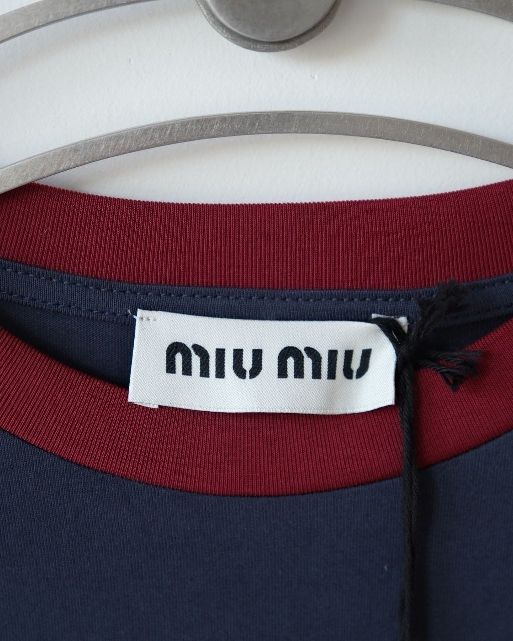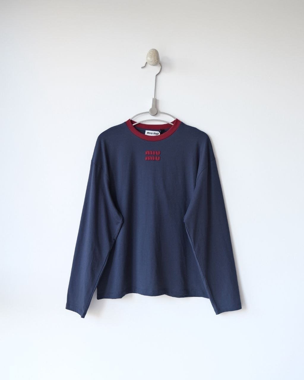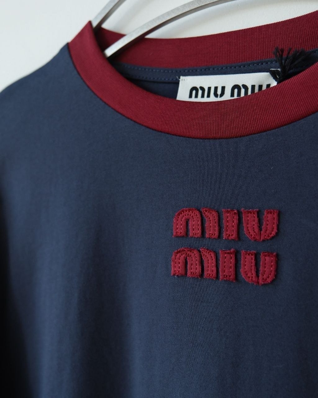 •(칩 탑재 최상급) MI* MI* SS26 Prelude 시리즈 로고 패치 자수 긴팔 티셔츠 입니다. 매장 구매 후 제작, 원단과 동일 사양으로 제작된 제품입니다. 원단은 전면 원판 그대로 제직한 100% 면 평직(저지) 소재를 사용했으며, 넥의 와인 컬러 리브와 가슴의 MIU 자수 패치 원단은 모두 맞춤 염색 처리하여 색 차이가 전혀 없는 0색차 버전입니다. 가슴의 MIU 로고 패치는 레이저 컷팅으로 정교하게 제작한 후, 자수기로 가장자리 둘레를 따라 봉제하여 완성하였고 착용 시 까슬거림이 없으며 뒷면에 실밥이 남지 않도록 마감했습니다.