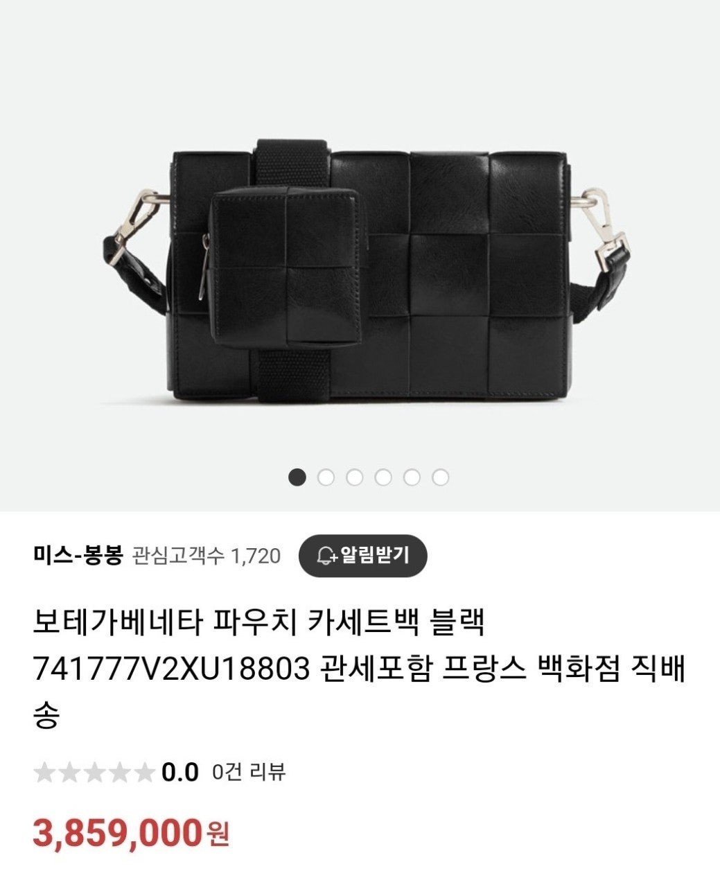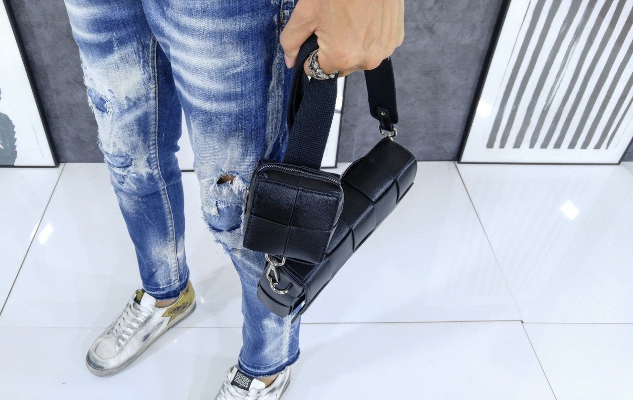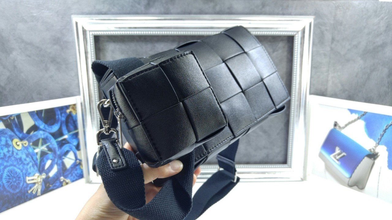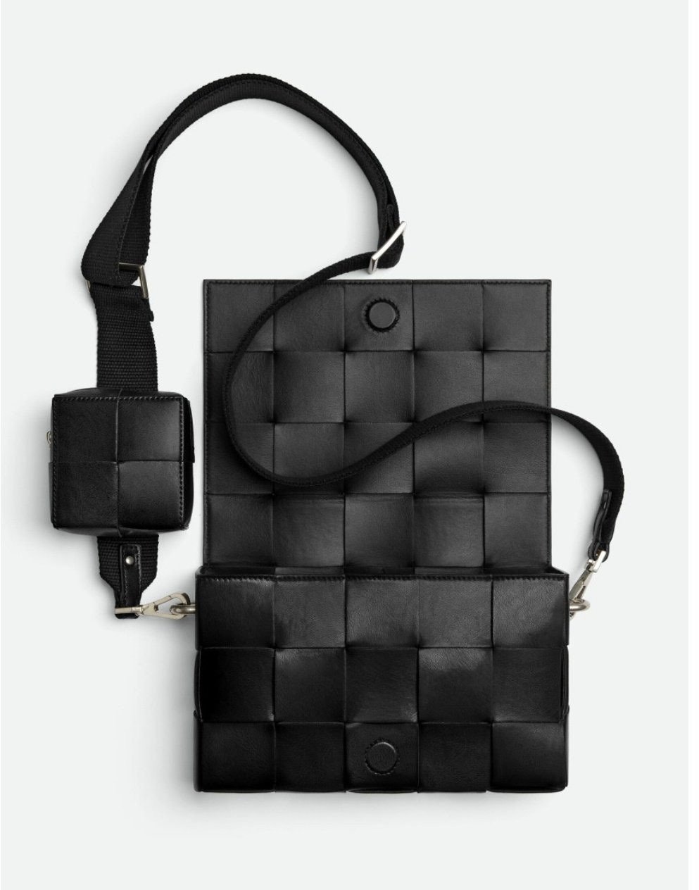 가죽 소재를 인트레치오 위빙으로 완성한 장인 정신이 돋보이는 크로스바디 백으로 슬라이드 온 지퍼 동전 파우치와 길이 조절 가능한 캔버스 스트랩이 있음