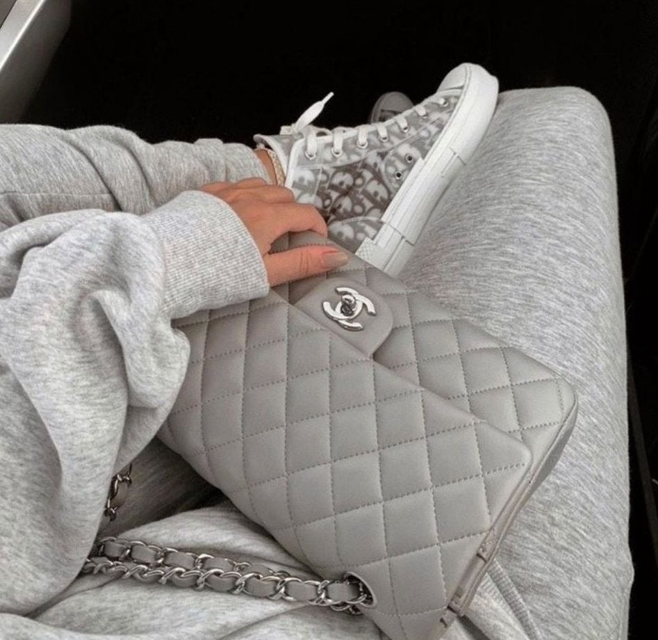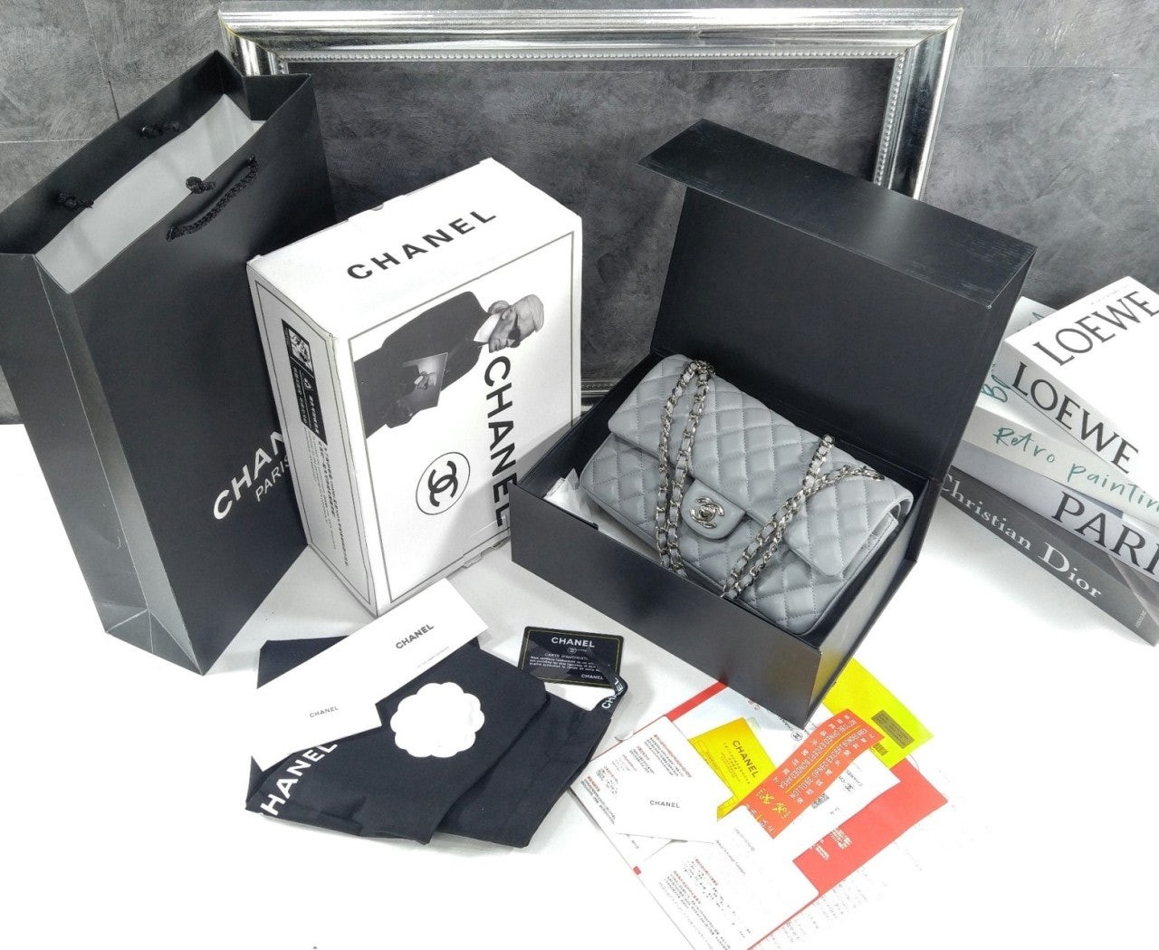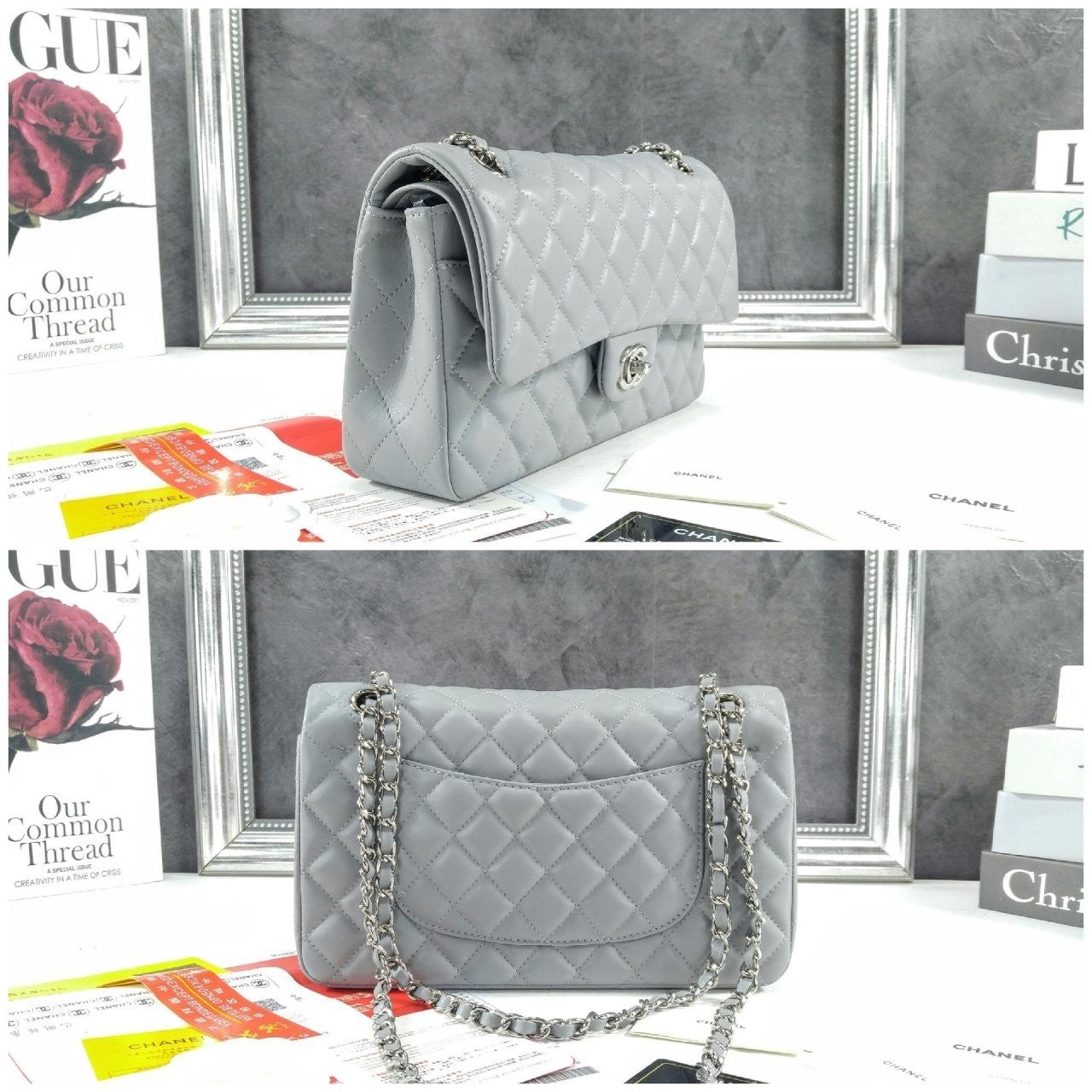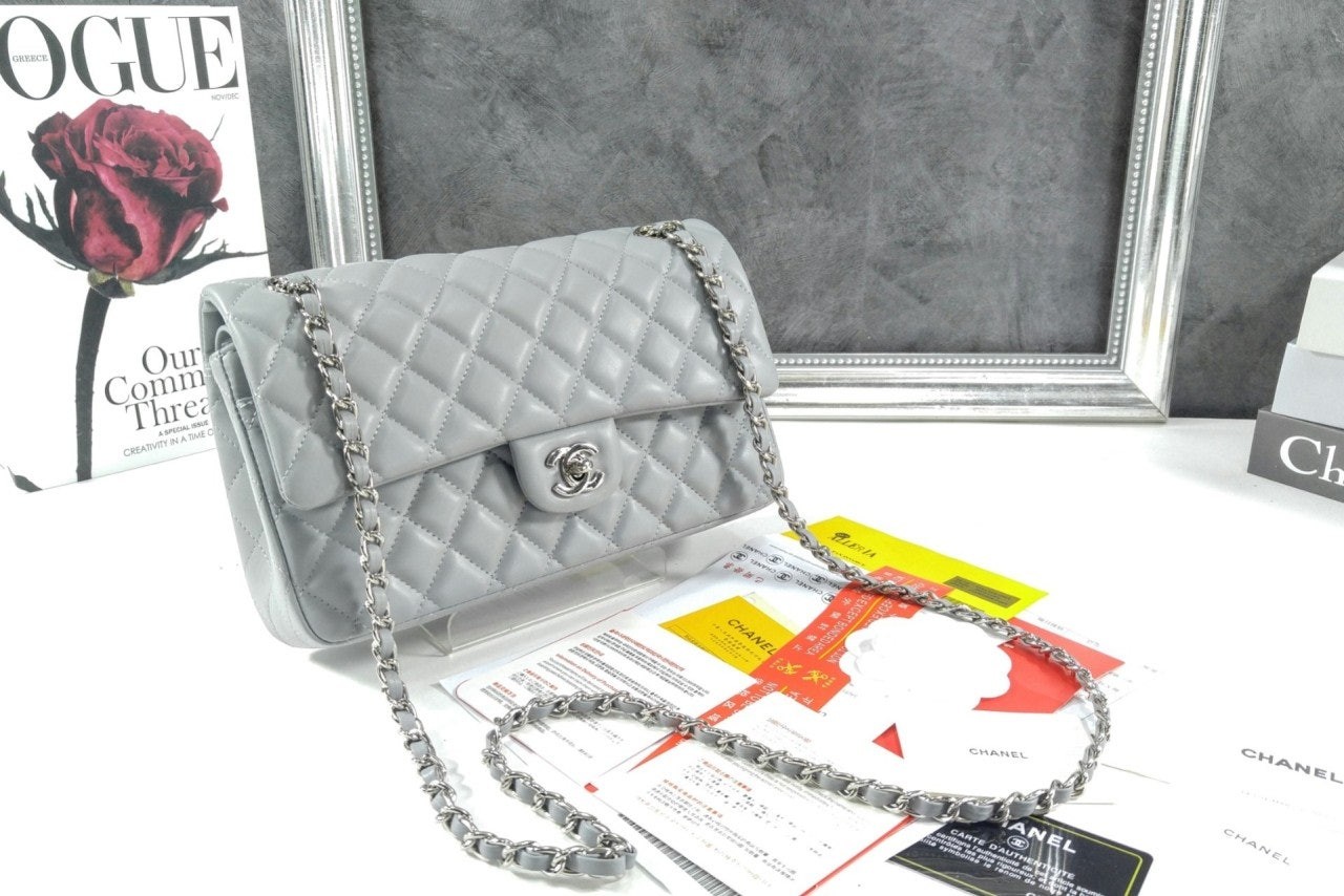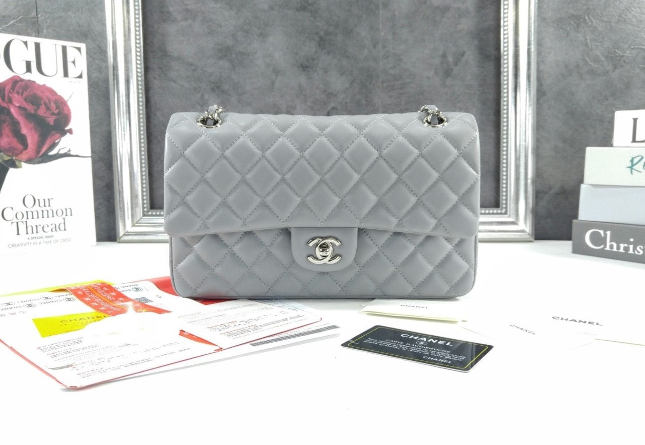 • 샤* 클래식 미듐 플랩백 램스킨 그레이 은장 A01112 풀박스 고급