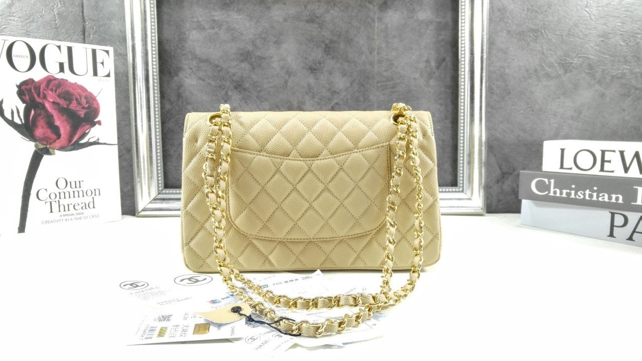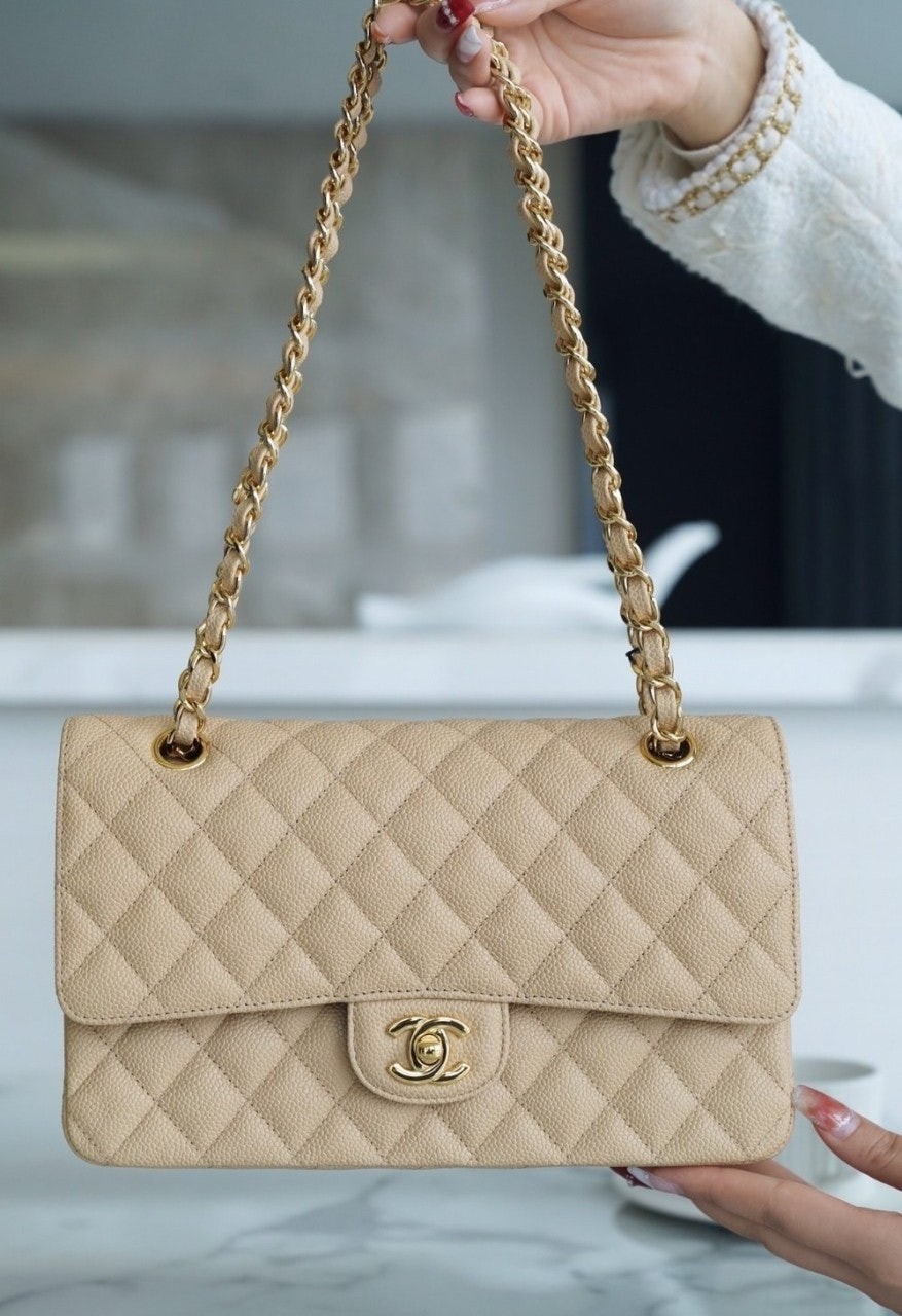 • 샤* 클래식 미디움 플랩백 그레인드 카프스킨 골드 메탈 베이지 풀박스 고급