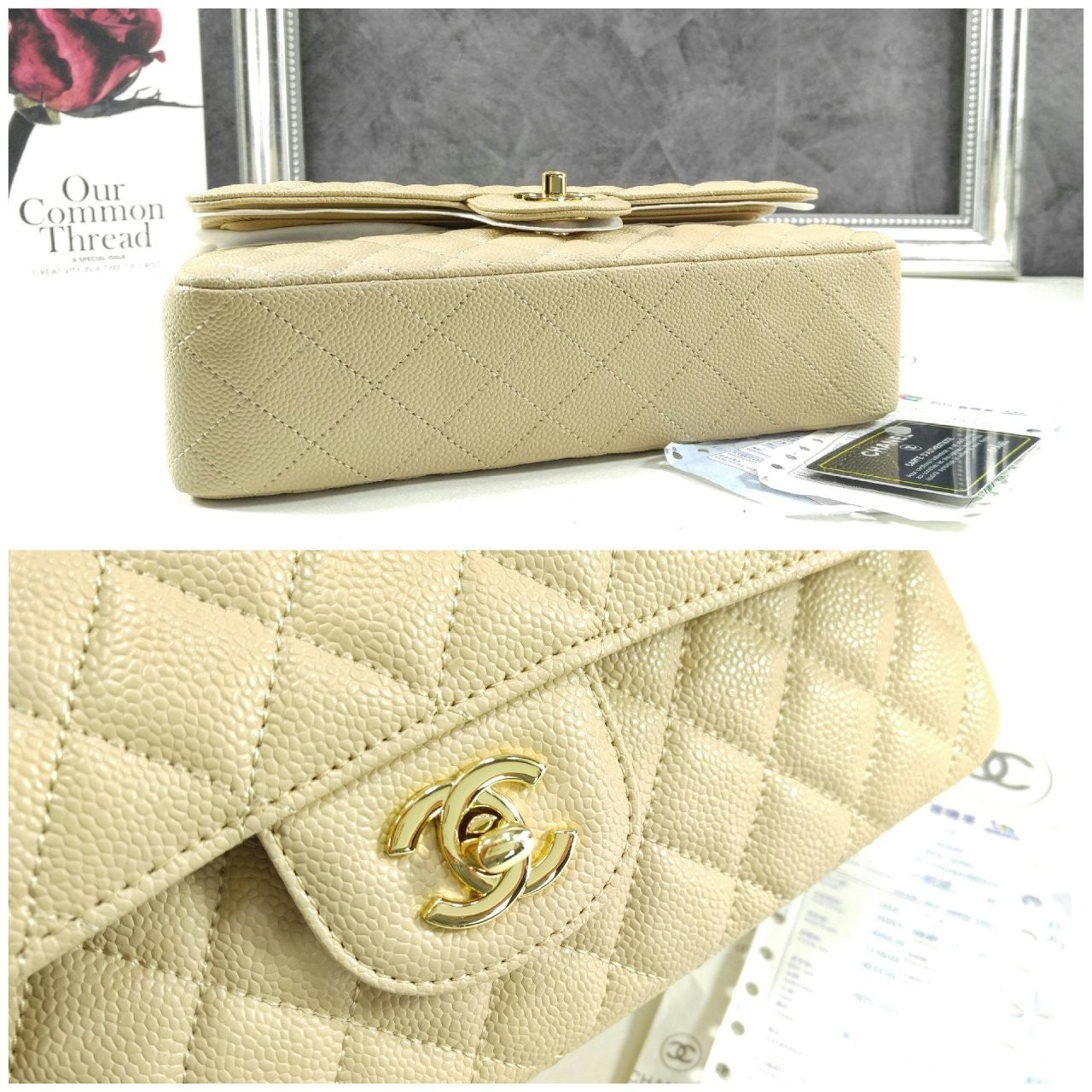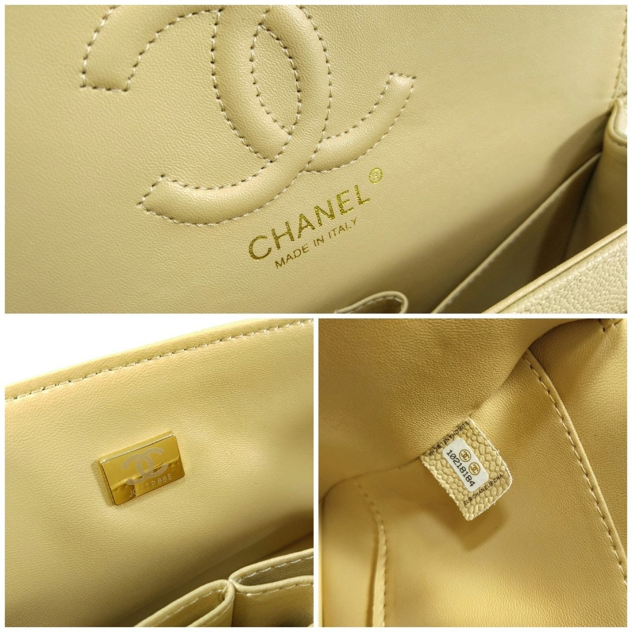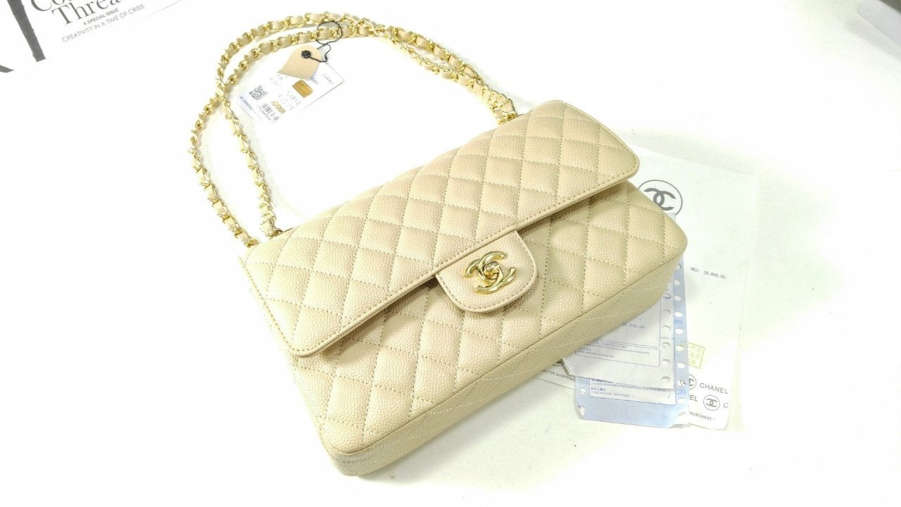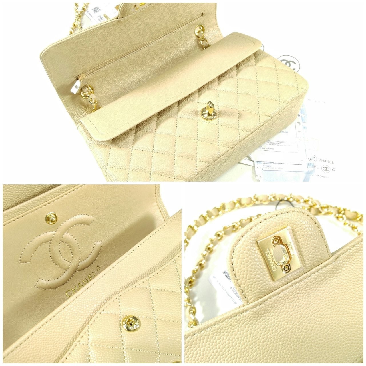 샤* 클래식 미디움 플랩백 그레인드 카프스킨 골드 메탈 베이지 풀박스 고급 요약정보 및 구매