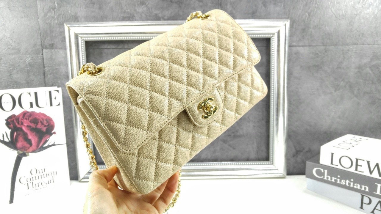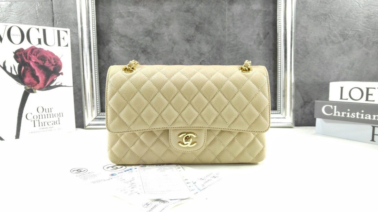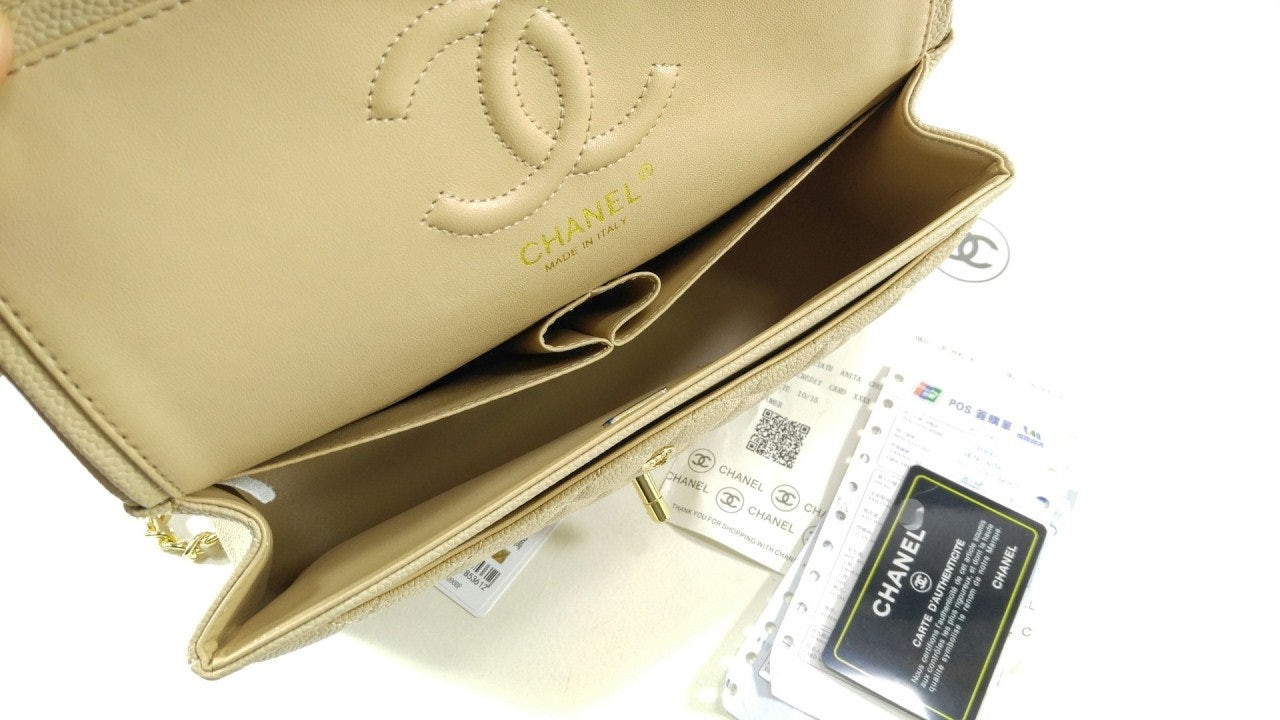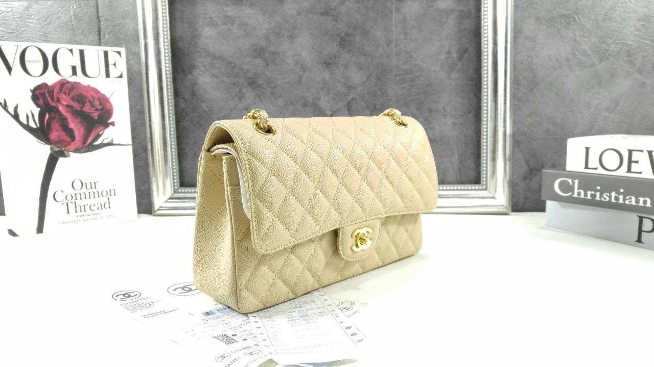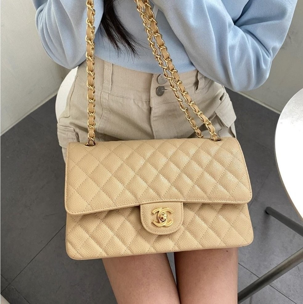 샤* 클래식 미디움 플랩백 그레인드 카프스킨 골드 메탈 베이지 풀박스 고급 요약정보 및 구매