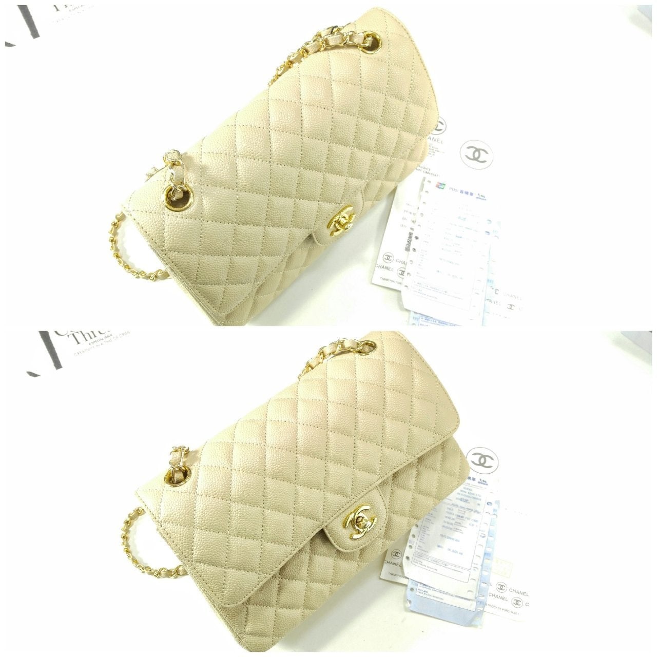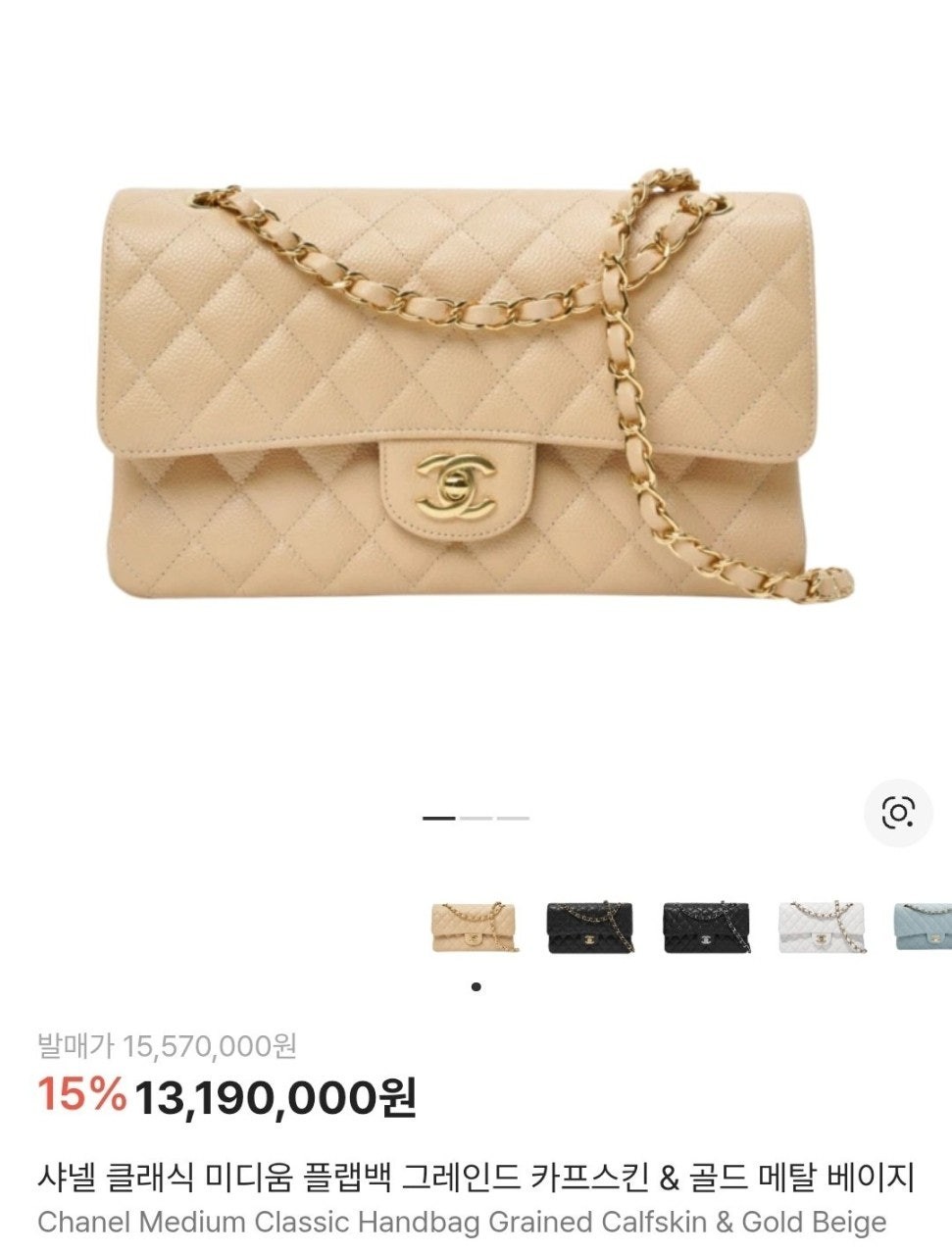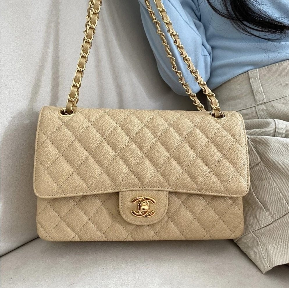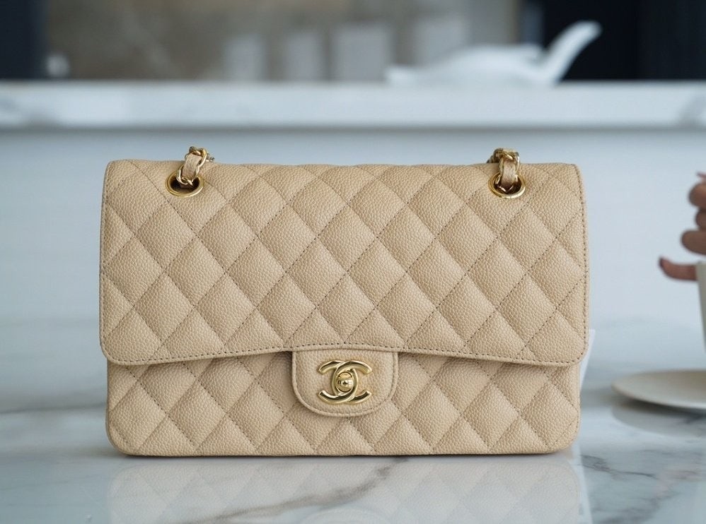 샤* 클래식 미디움 플랩백 그레인드 카프스킨 골드 메탈 베이지 풀박스 고급 요약정보 및 구매