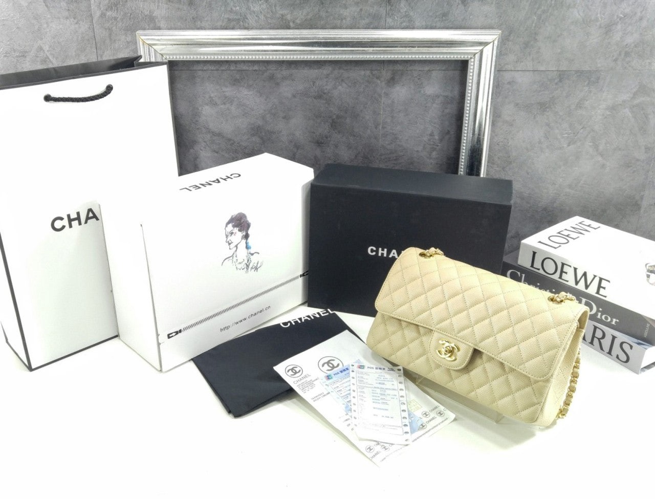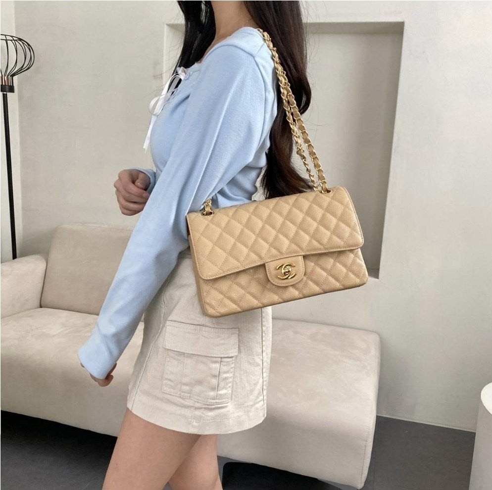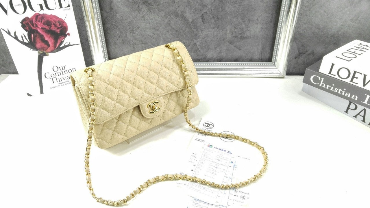 • 샤* 클래식 미디움 플랩백 그레인드 카프스킨  골드 메탈 베이지 풀박스 고급