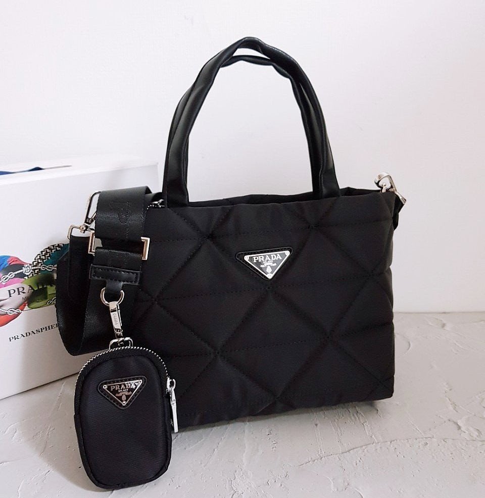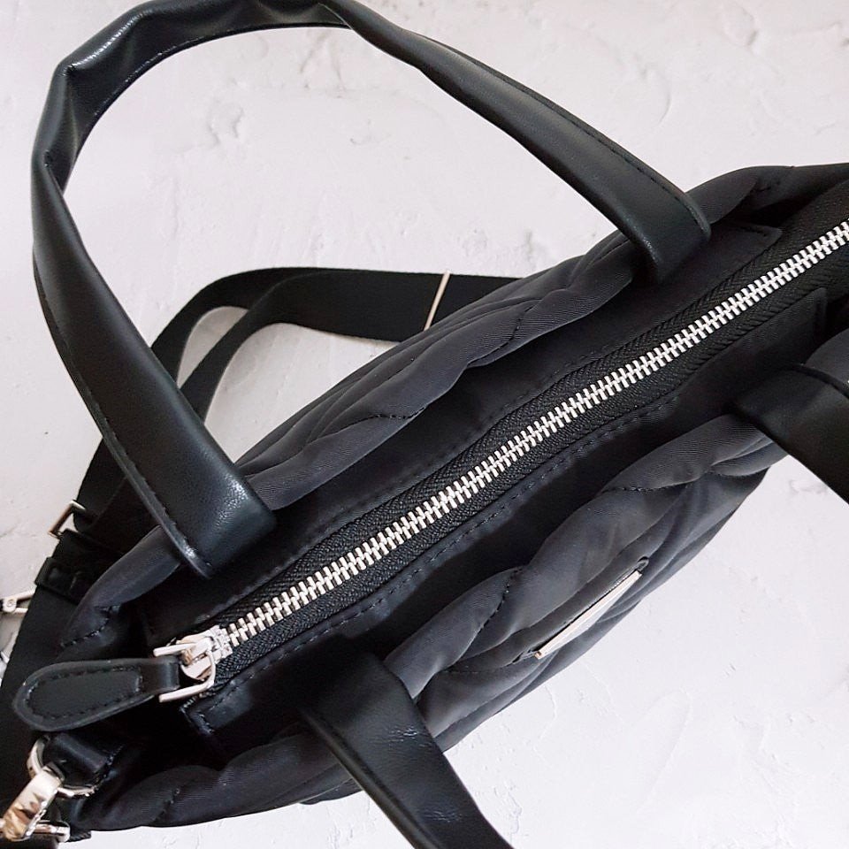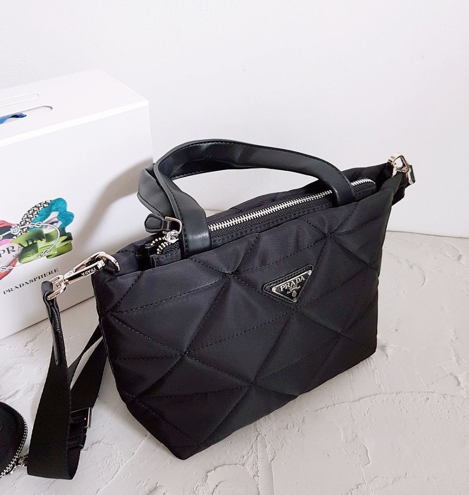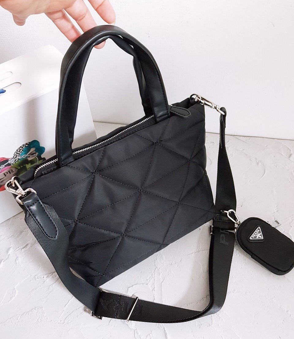 • 프** 고급 리나일론 나파 트라이앵글 퀼팅 패딩 더블핸들 지퍼 포켓 토트 블랙