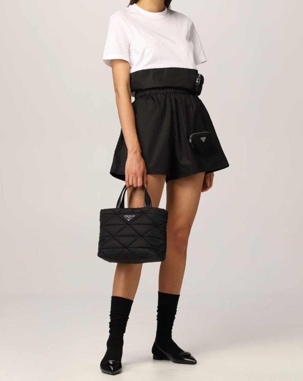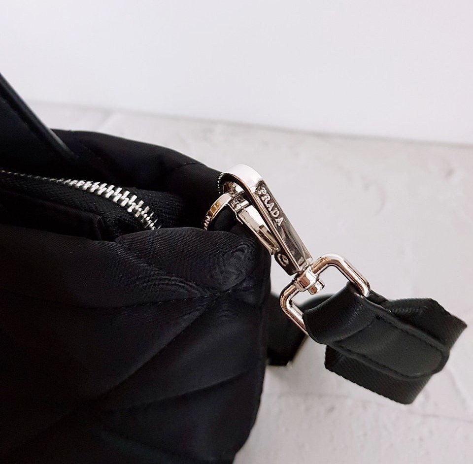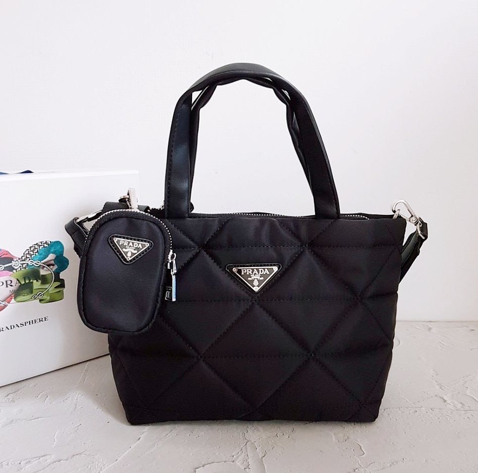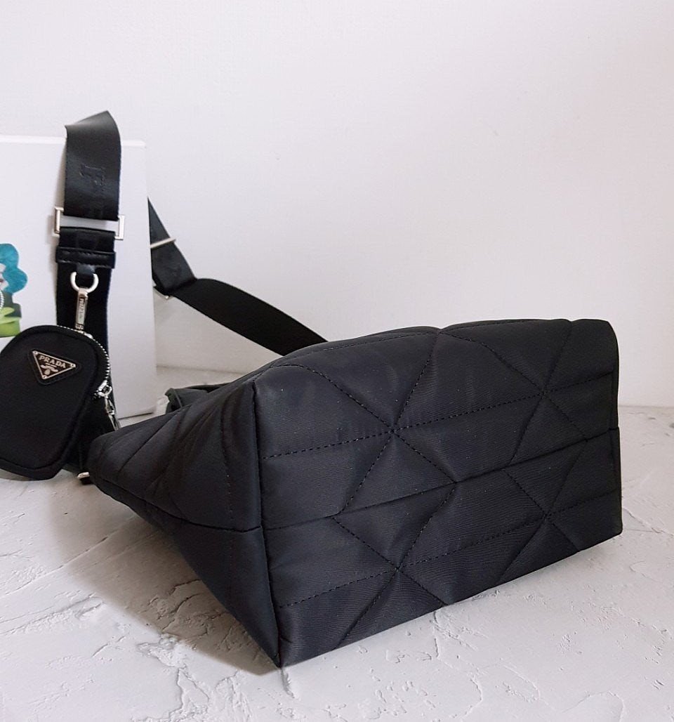 • 프** 고급 리나일론 나파 트라이앵글 퀼팅 패딩 더블핸들 지퍼 포켓 토트 블랙