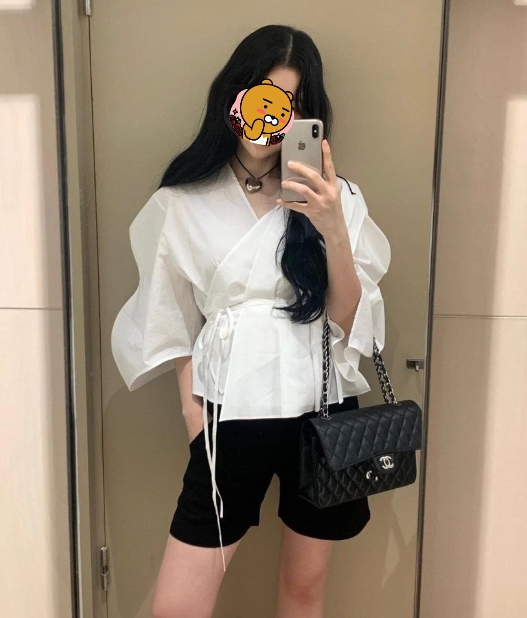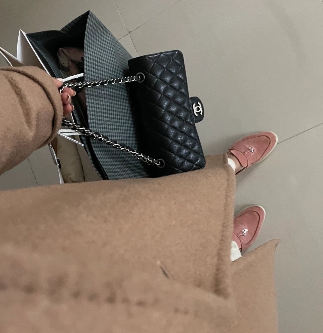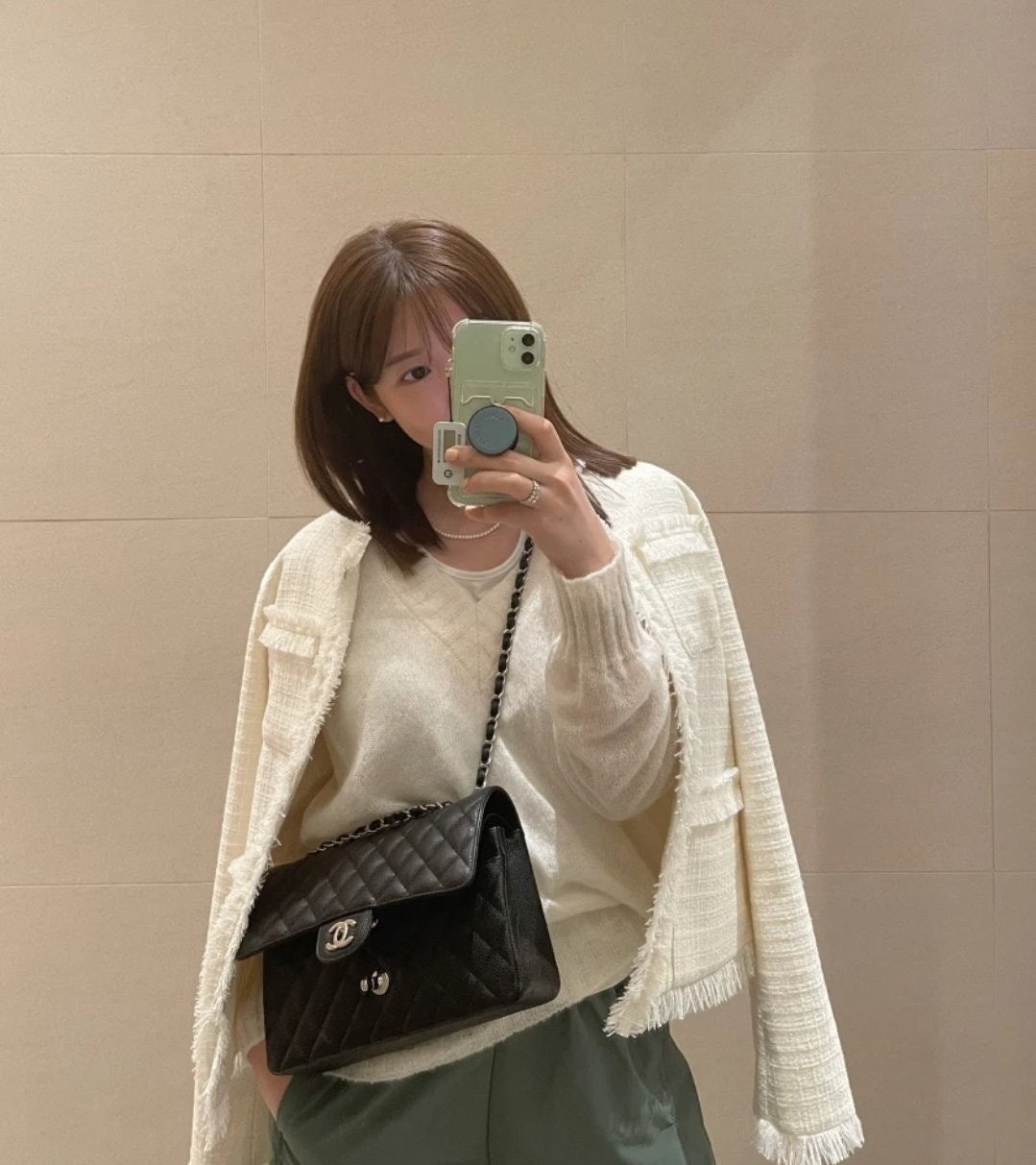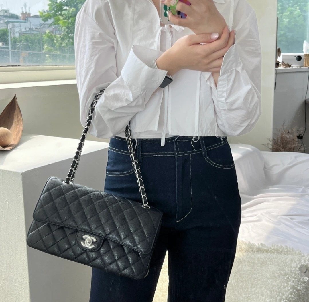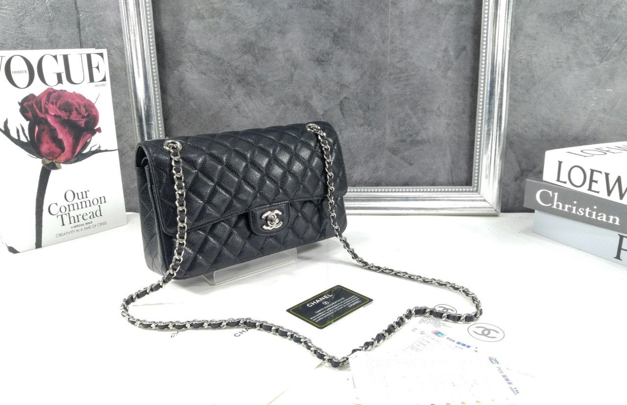 • 샤* NEW 클래식 미디움 플랩백 그레인드 카프스킨  실버 메탈 블랙 풀박스