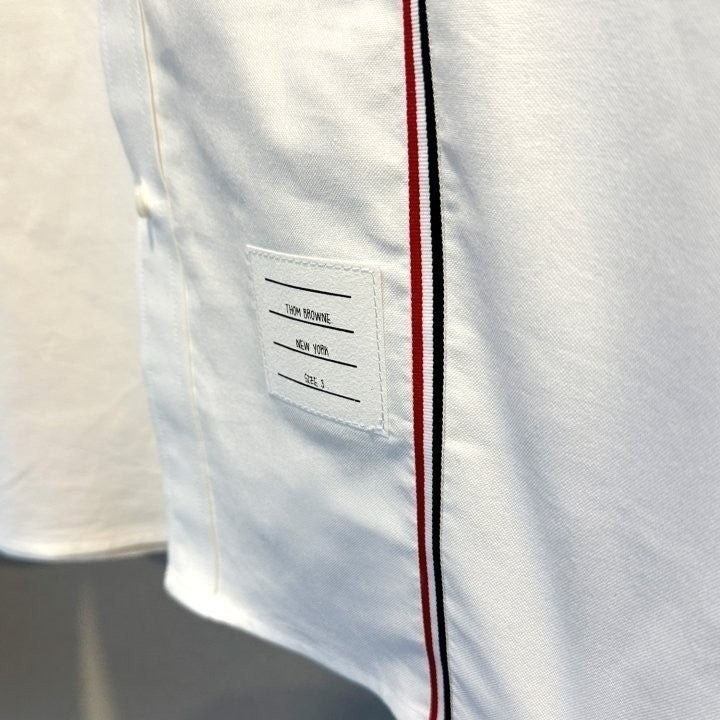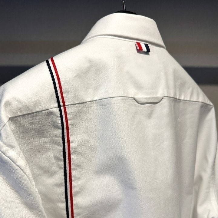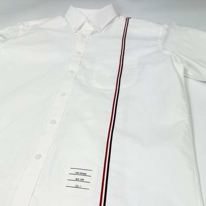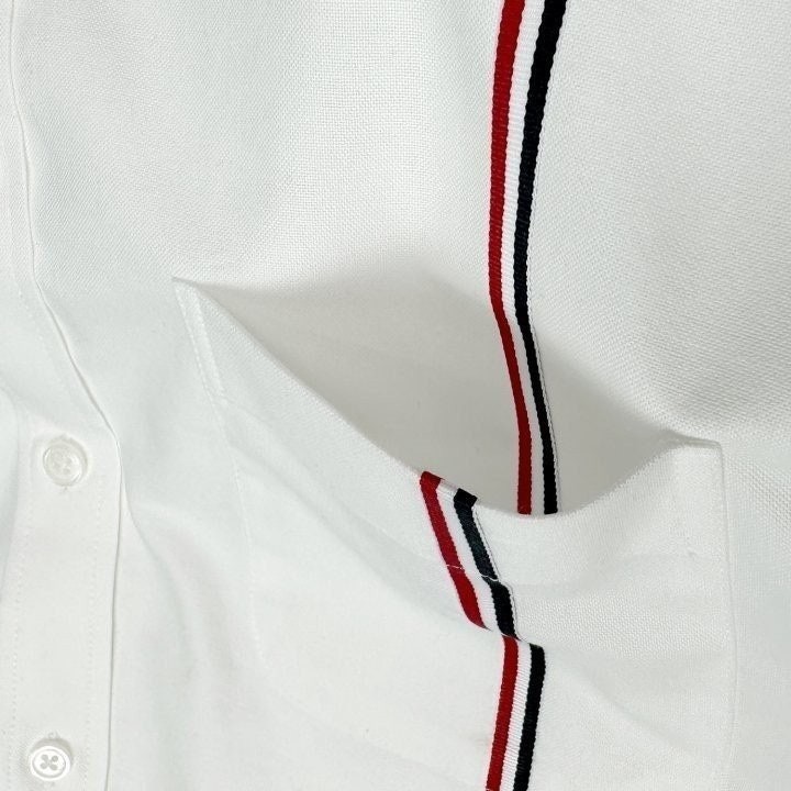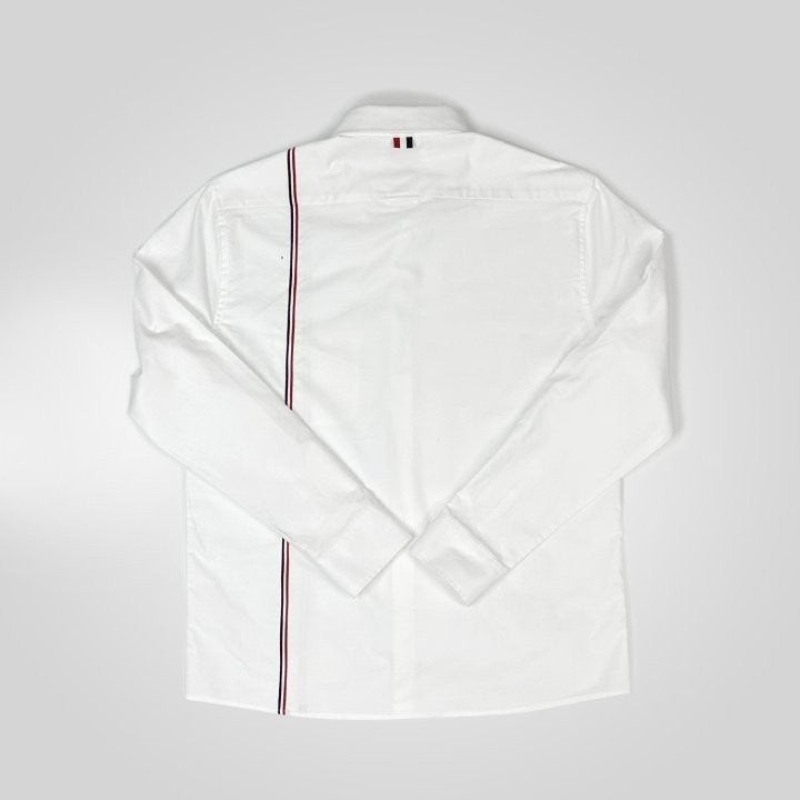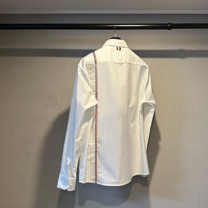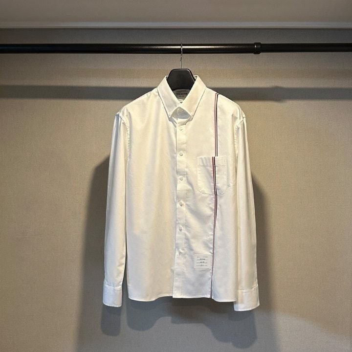 원단으로 스판이 함유되어있고 가볍고 부드러워 착용감이 좋은 상품입니다 정장 이너 출근룩 어디에나 잘 어울리는 제품의 셔츠로 톰*사 만의 트레이드 마크인 삼선을 으로 포인트를 준 제품 입니다.