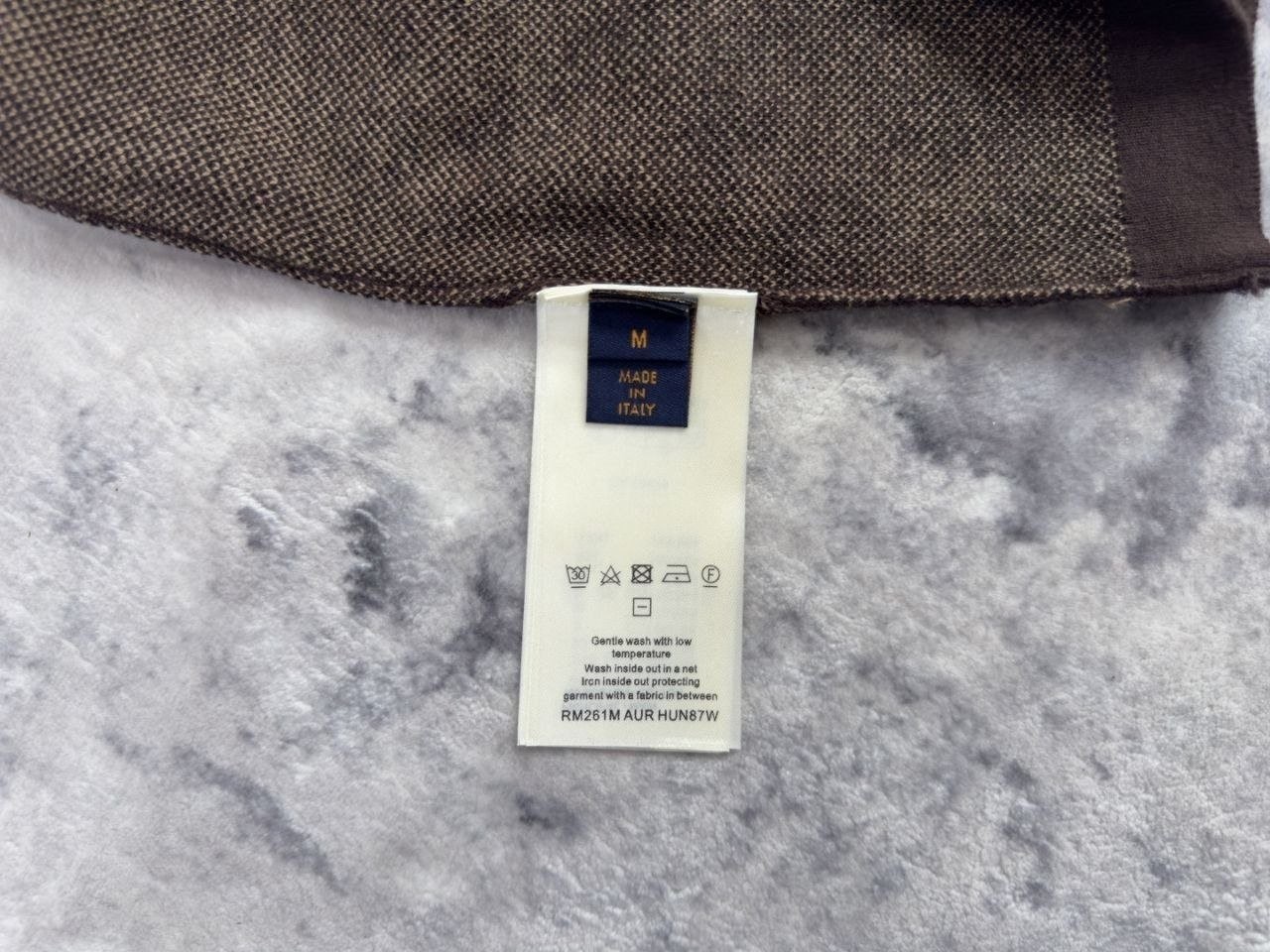 •원사 염색부터 제작까지 고급 사양으로 완성된 제품입니다. 원사는 40수 고연섬 100% 정선 면실을 주문 염색하여 사용했고, YB 기준에 맞춰 색상 매칭 정확도가 약 98%에 달합니다. 독일 수입의 Stoll 14게이지 편직기로 그라데이션 자카드 편직 공법을 적용해 제작하며, 한 벌당 소요 시간은 약 195분입니다. 이후 18게이지 손바늘(수작업) 시보리 공법으로 마감하였고, 이 제품은 YB 기준에 따라 서로 다른 두 종류의 게이지(번수)의 실을 조합해 제작합니다. 특히 브라운 컬러는 다른 색상보다 더 가는 실을 사용해 은은한 음영(다크 패턴) 효과를 냈습니다. 특정 3종 라벨과 워시(세탁) 라벨이 포함되어 출고됩니다.