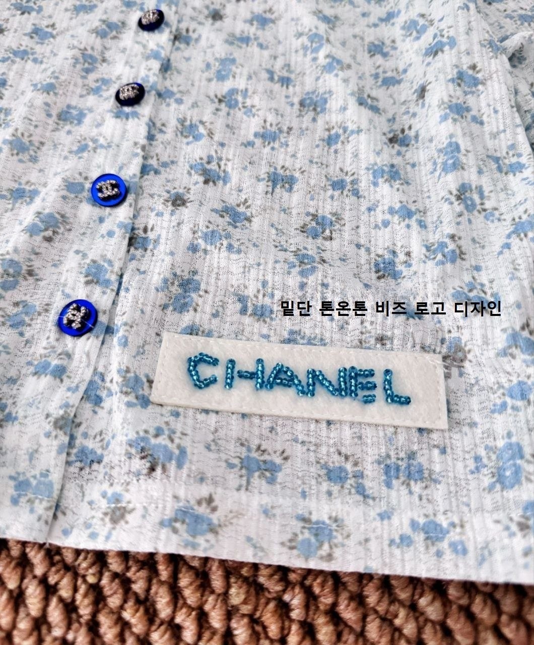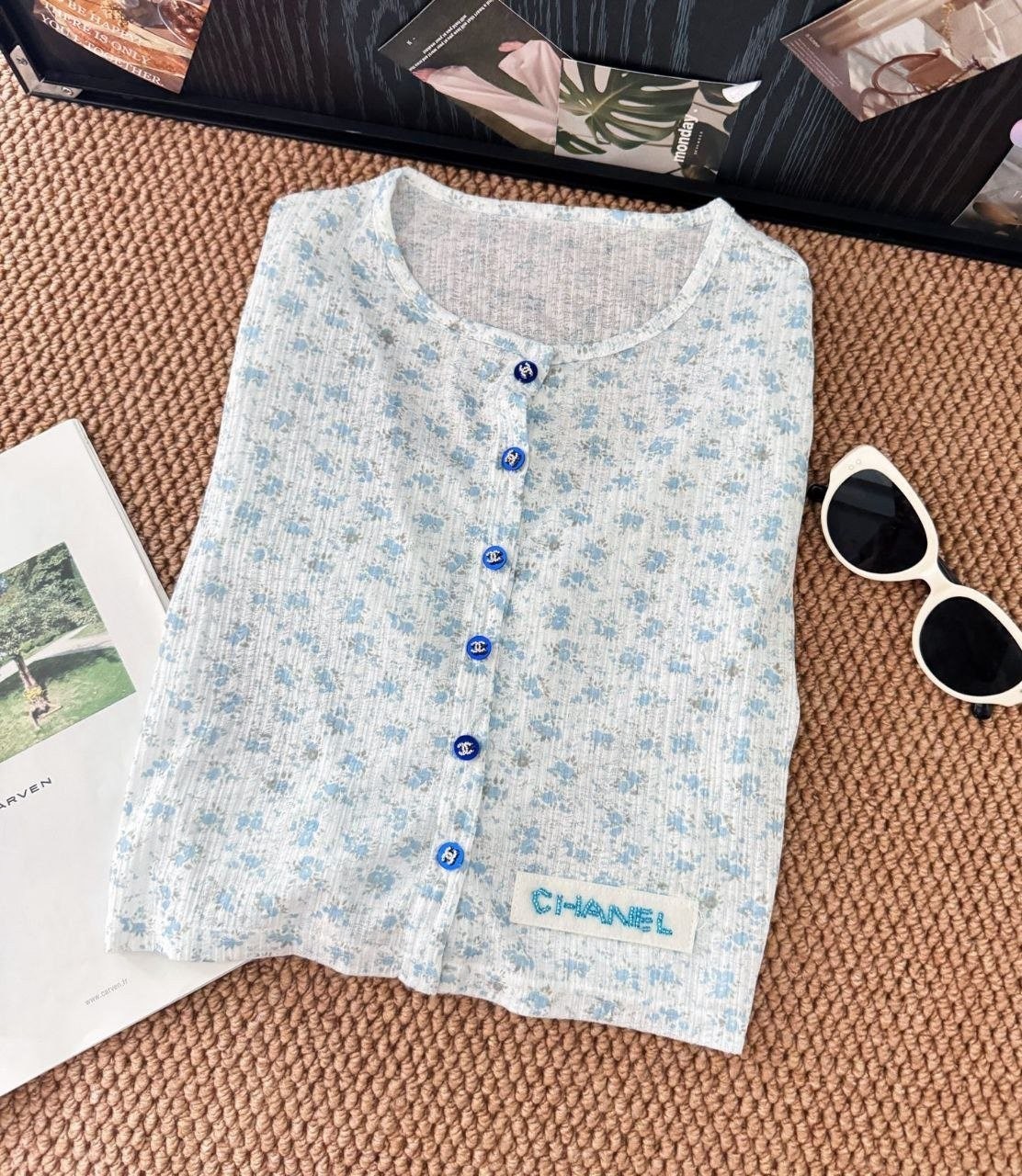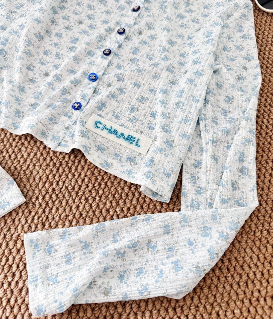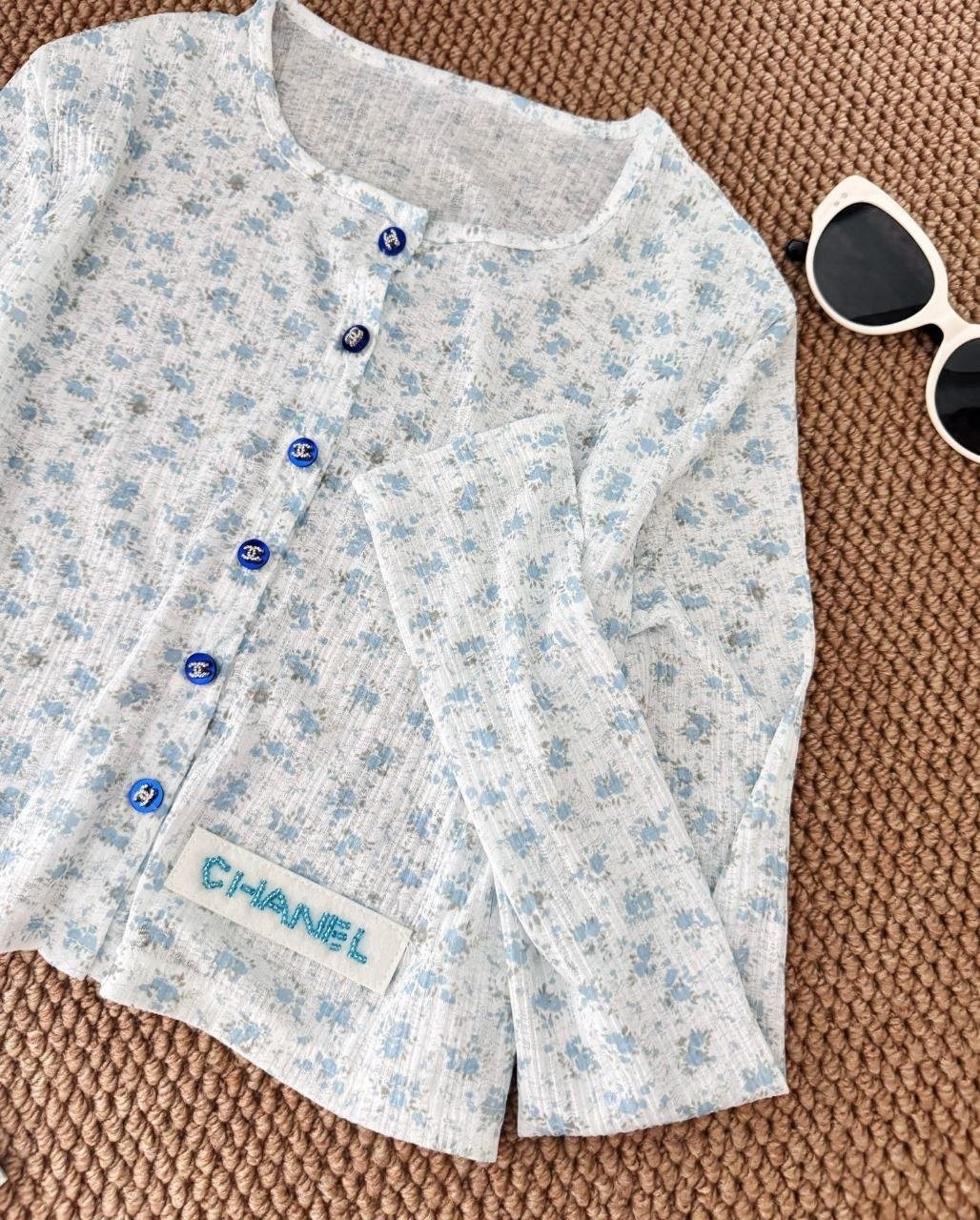 •블루 톤의 무드가 돋보이는 달콤하고 귀여운 미니 플라워 패턴입니다. 시각적으로 더 시원해 보이게 해주는 스타일로, 얇은 가디건 하나만으로도 분위기가 확 살아납니다. 정말 예쁘고 세련된 느낌이에요. 인스타에서 인기 많은 샤* 스타일의 꽃무늬 탑으로, 맞춤 제작한 원단과 단추 등 디테일이 정교합니다.