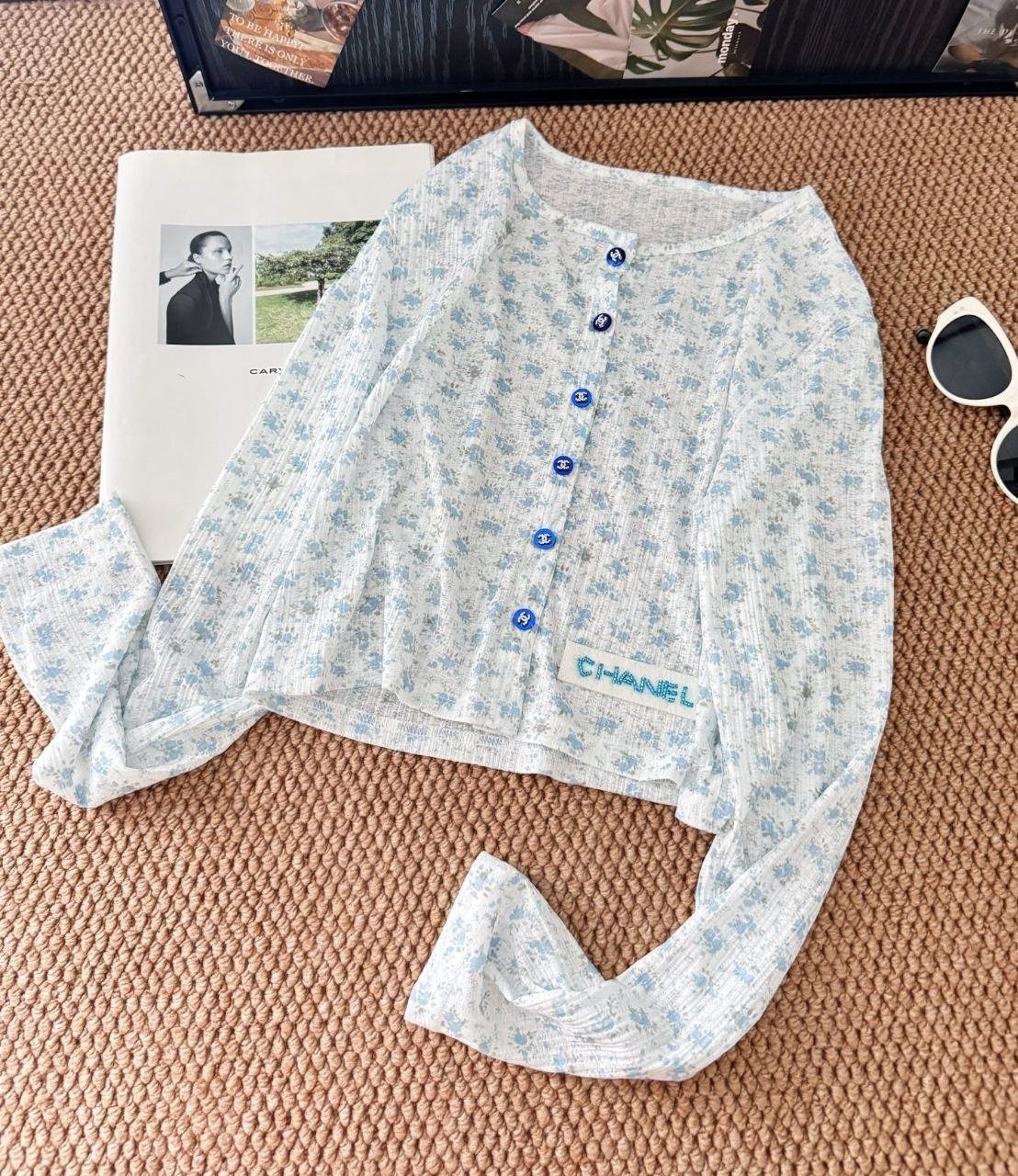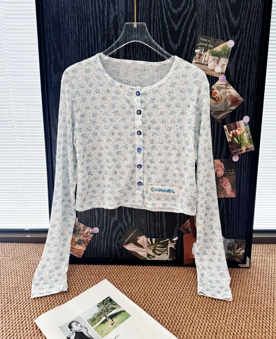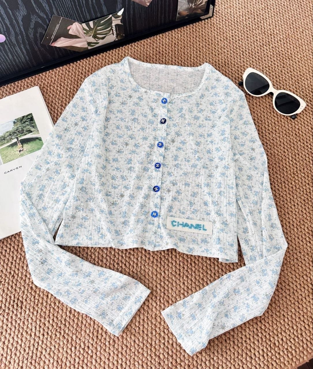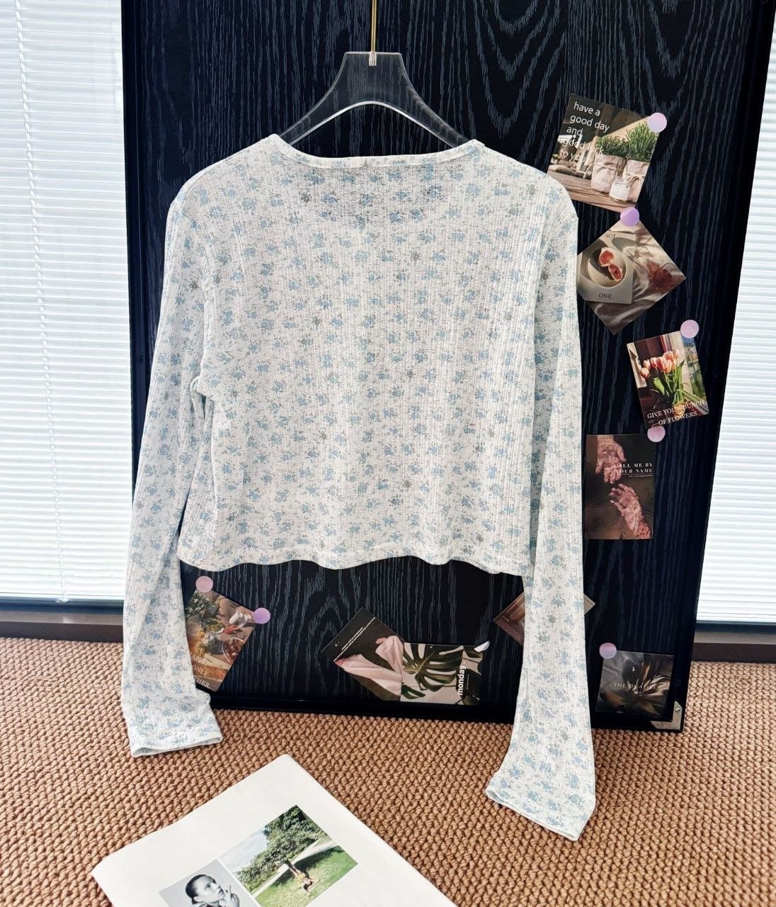 •블루 톤의 무드가 돋보이는 달콤하고 귀여운 미니 플라워 패턴입니다. 시각적으로 더 시원해 보이게 해주는 스타일로, 얇은 가디건 하나만으로도 분위기가 확 살아납니다. 정말 예쁘고 세련된 느낌이에요. 인스타에서 인기 많은 샤* 스타일의 꽃무늬 탑으로, 맞춤 제작한 원단과 단추 등 디테일이 정교합니다.