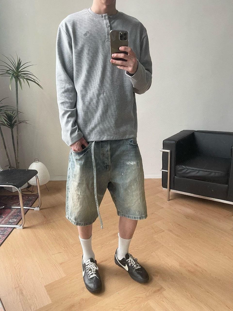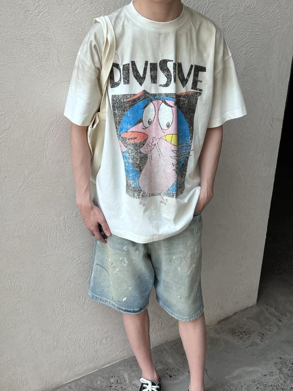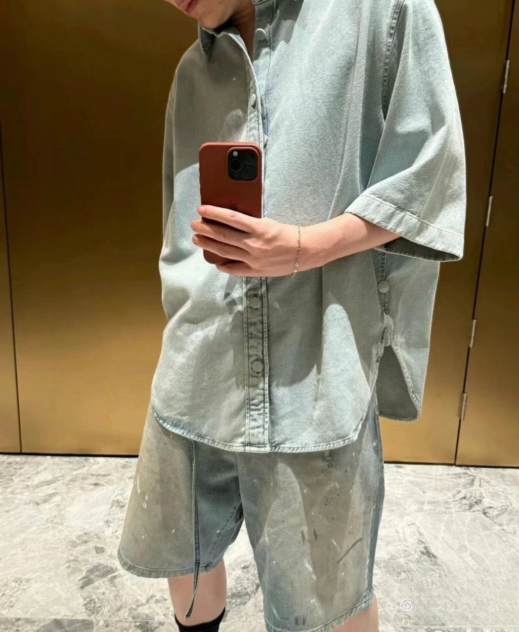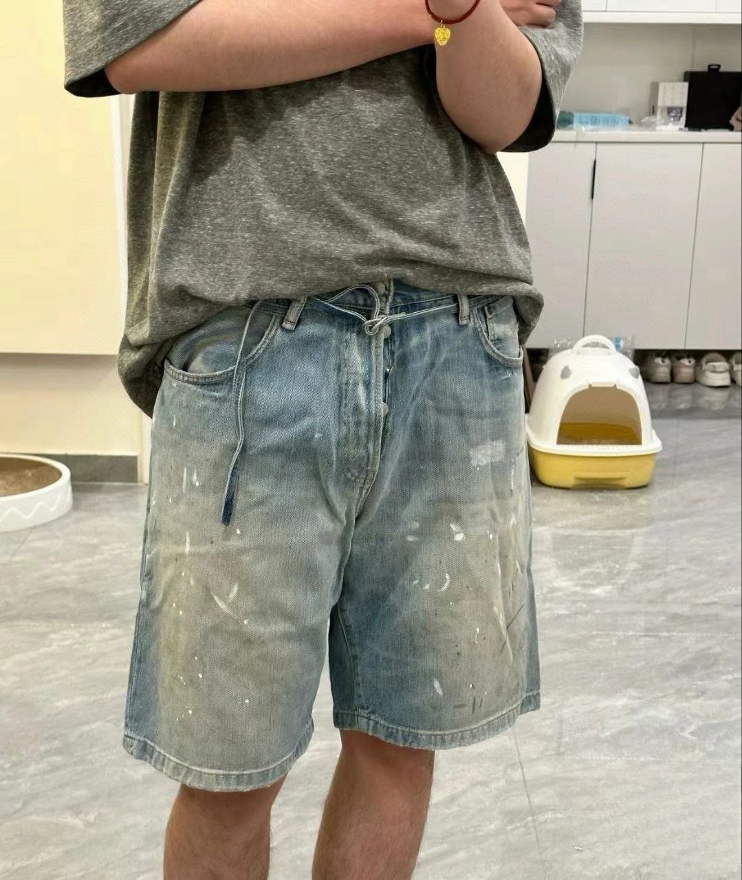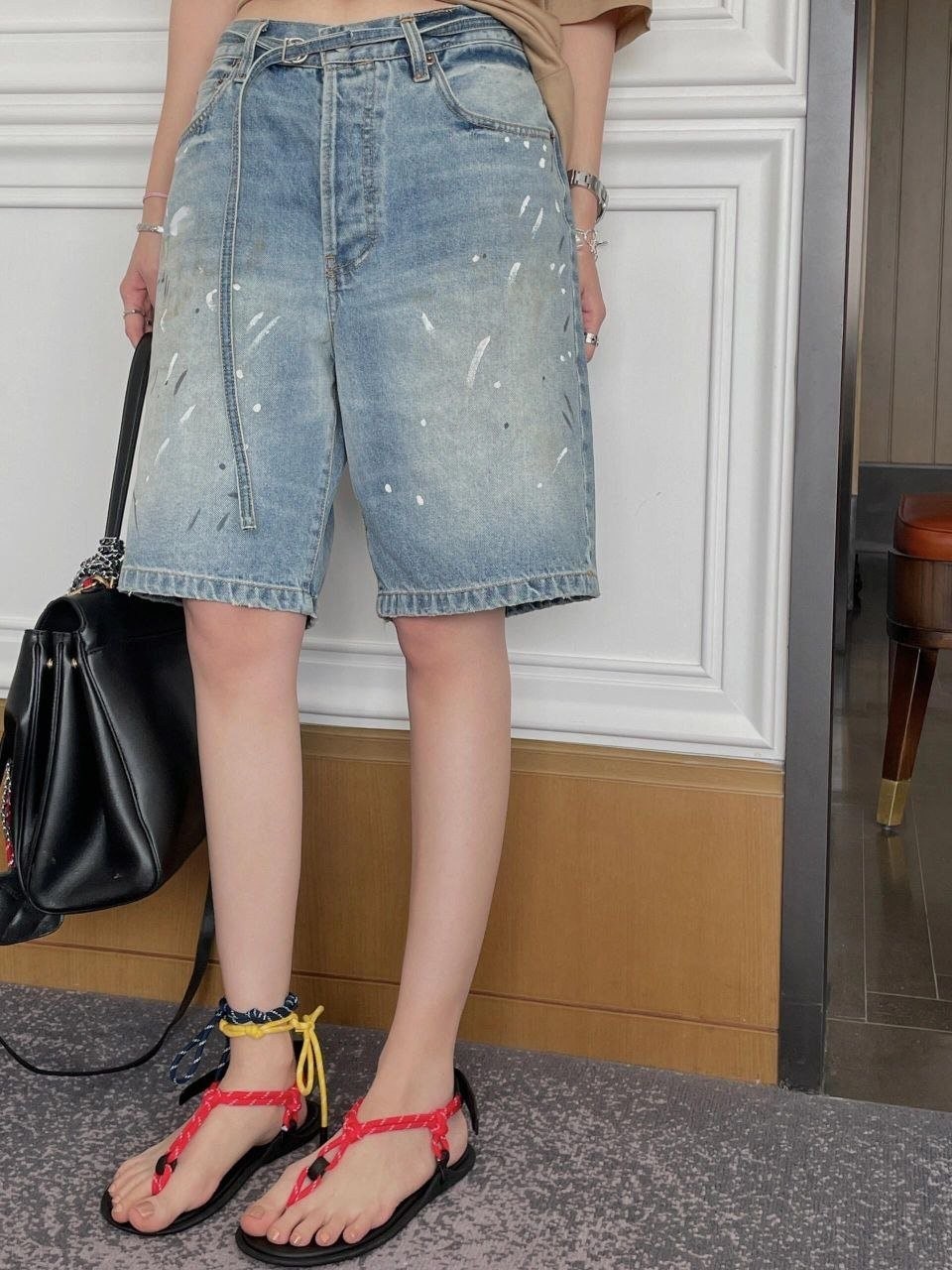 •???? 티셔츠, 셔츠, 민소매 어느 상의와 매치해도 이 데님 반바지는 쉽게 소화할 수 있습니다. 페인트를 흩뿌린 듯한 디자인은 더욱 눈길을 사로잡으며 당신의 개성 있는 매력을 드러냅니다. 부자재는 모두 풀 세트로 맞춤 제작되었으며, 뒷 허리에는 소가죽 로고 플레이트가 있습니다! 금속 부자재는 모두 빈티지 느낌으로 로고가 새겨져 있어 디테일이 가득합니다!