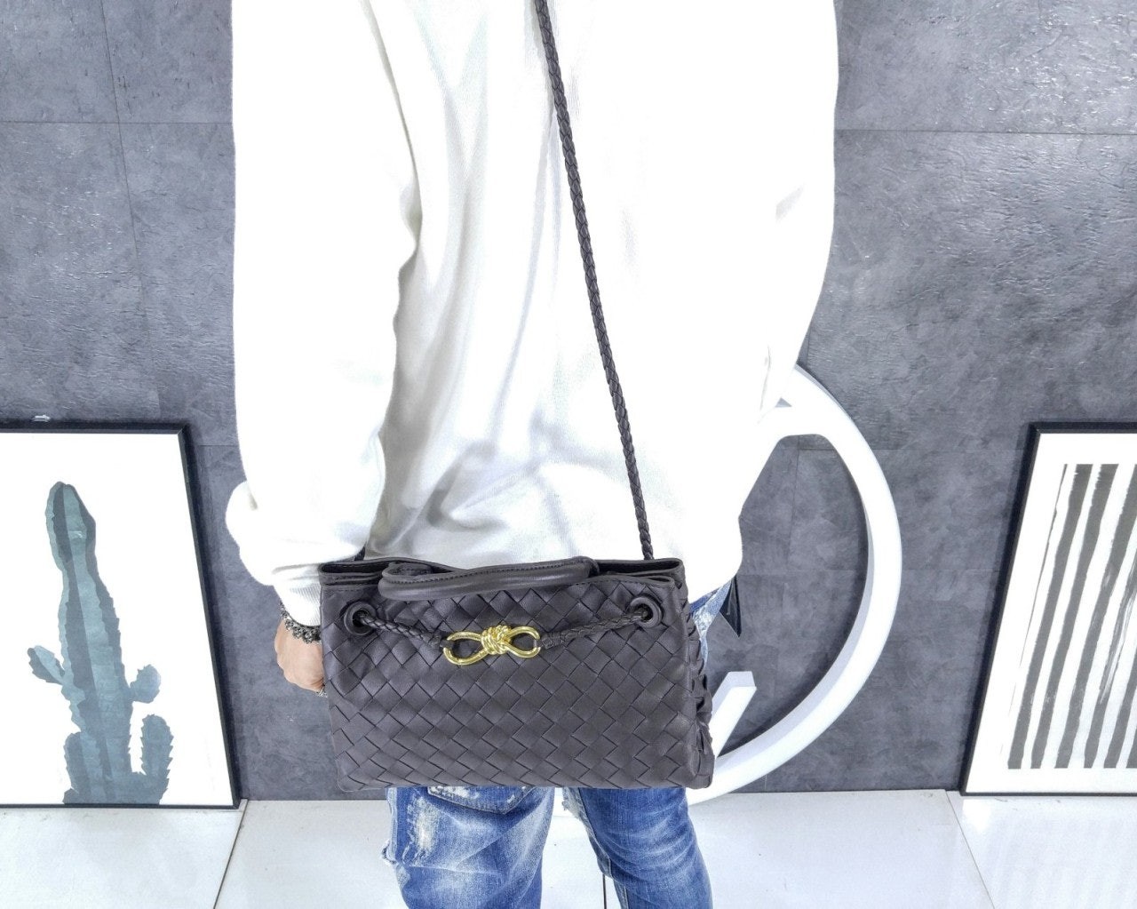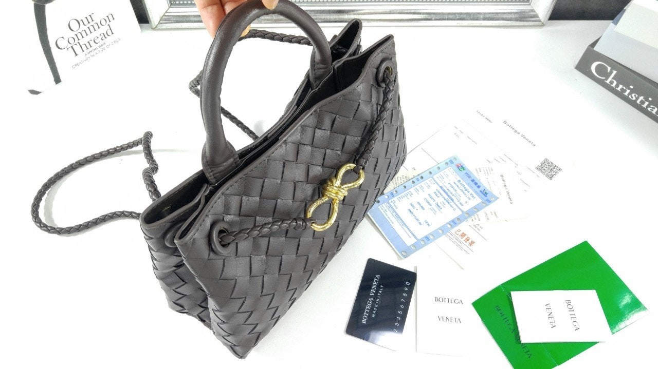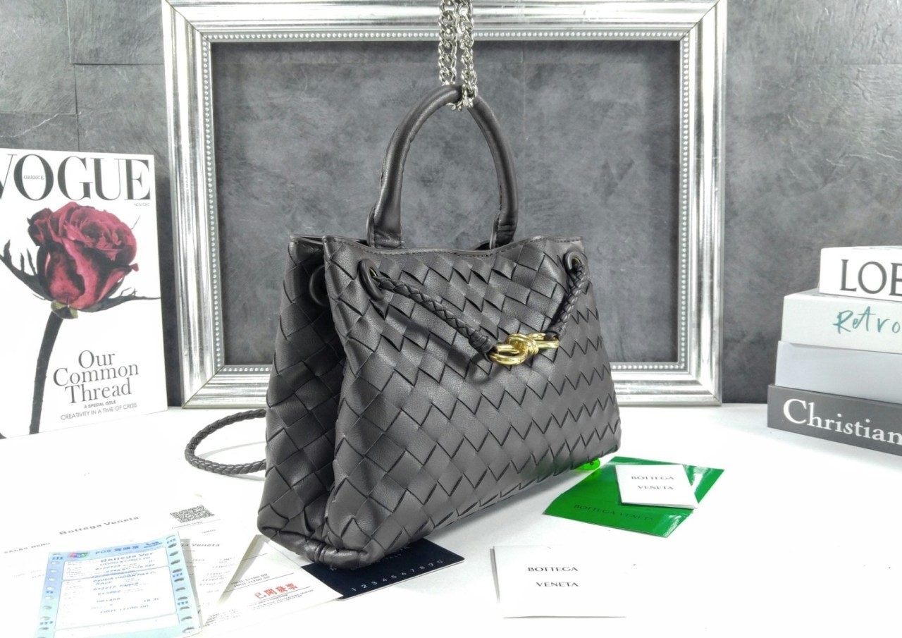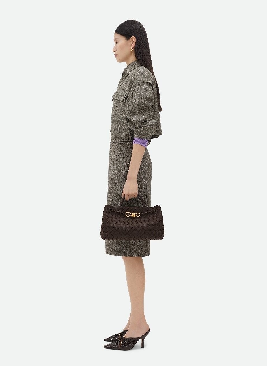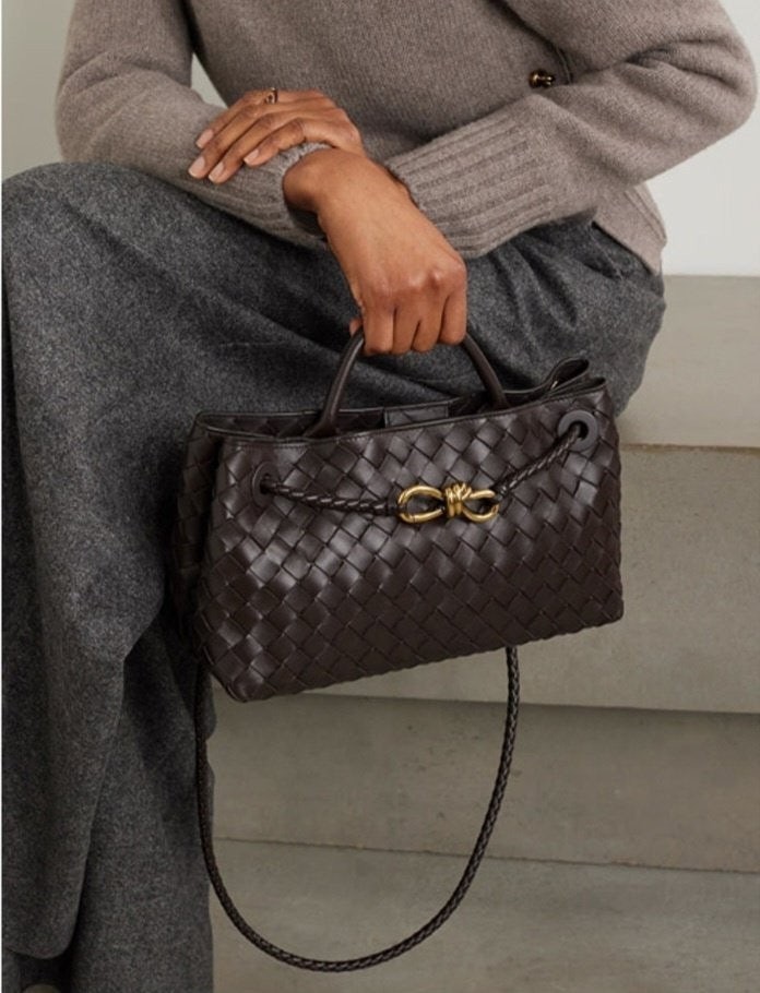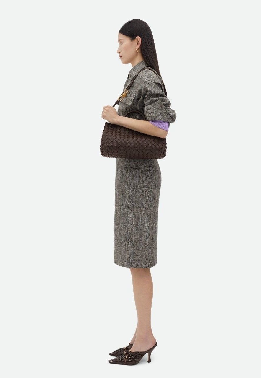 시그니처 놋 디테일 및 슬라이딩 크로스 스트랩을 갖춘 유연한 인트레치아토 가죽 소재의 긴 실루엣을 가진 탑 핸들 백.