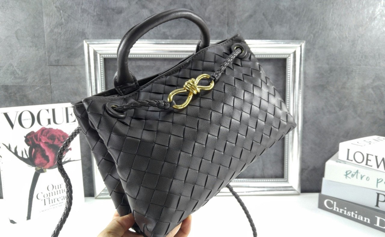 • 슬라이딩 크로스 스트랩을 갖춘 이스트-웨스트 인트레치아토 가죽 소재의 탑 핸들 백