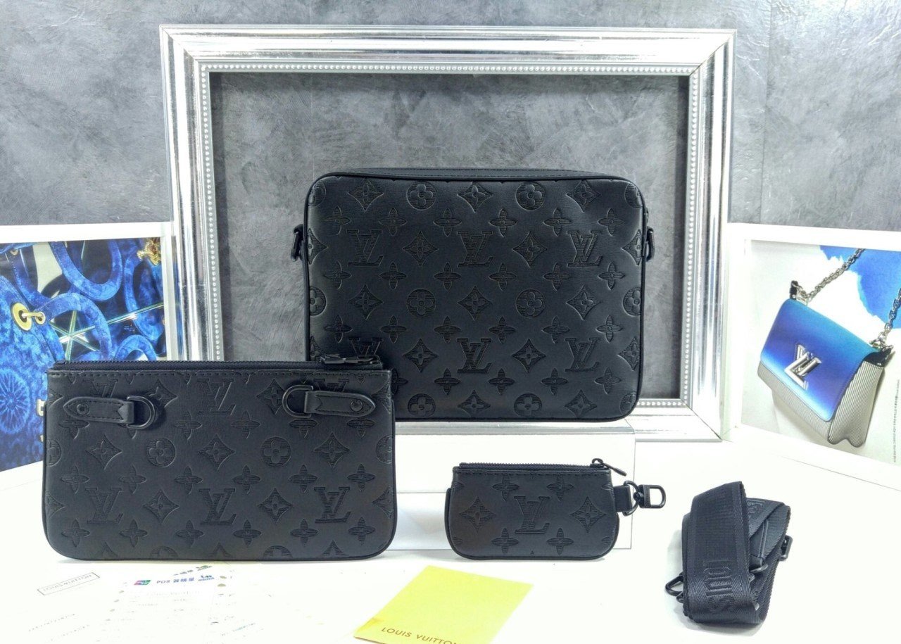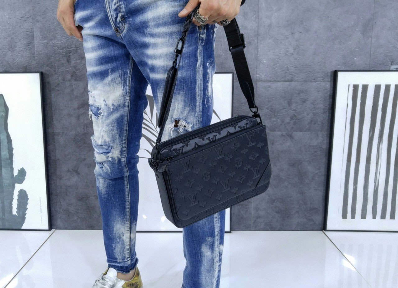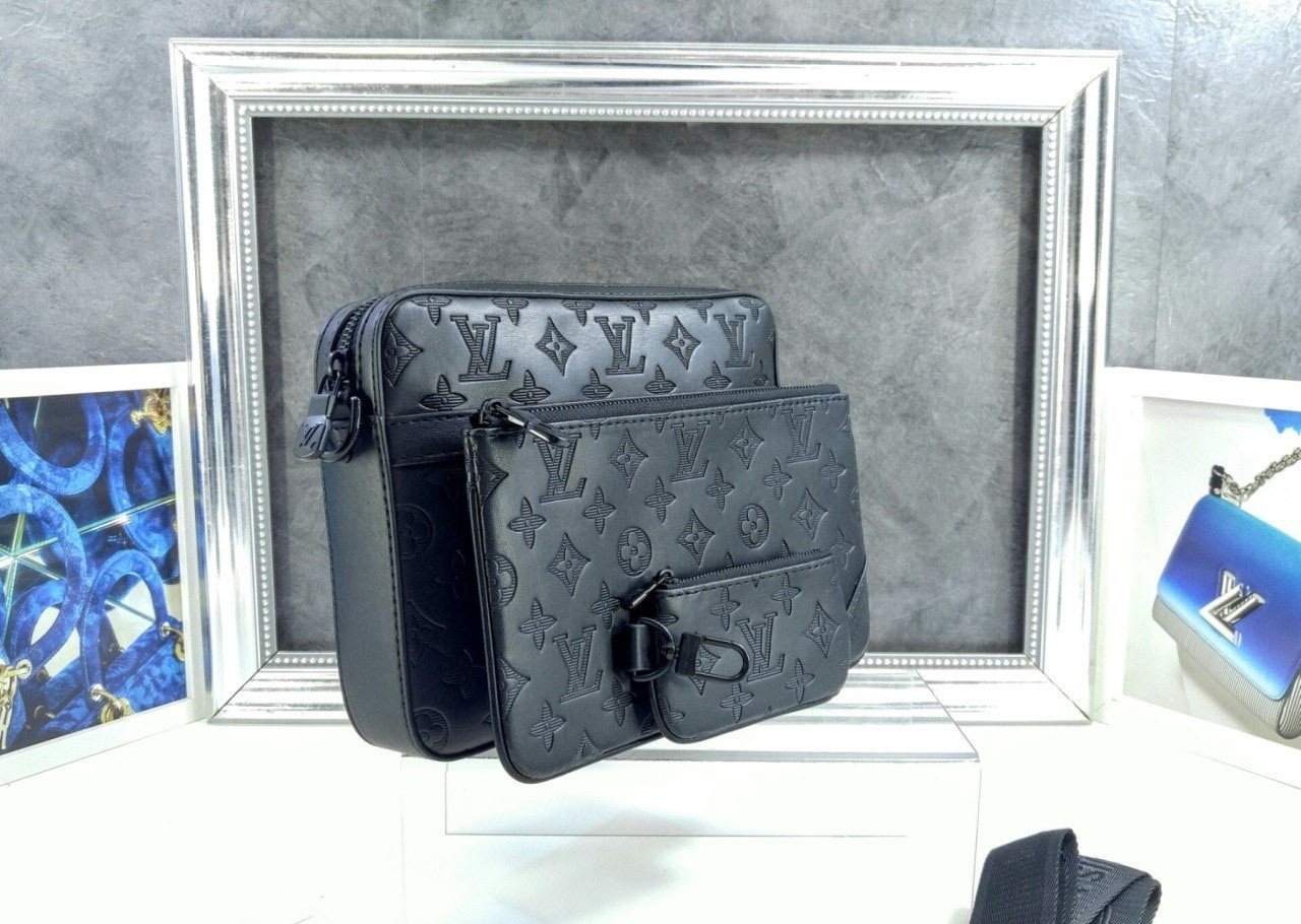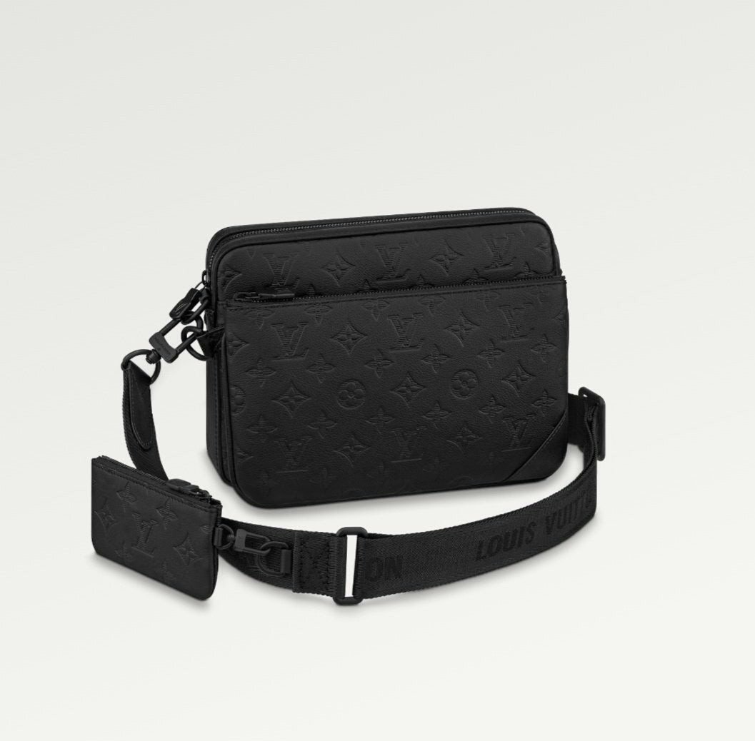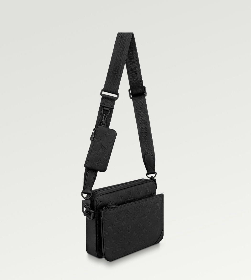 모노그램을 양각으로 새긴 송아지 가죽 소재의 트리오 메신저. 스타일리시한 하이브리드 백. 메인 수납 공간, 탈착 가능한 앞면 지퍼형 포켓과 스트랩에 달린 작은 탈착형 코인 퍼스가 특징. '루*'이 새겨진 자카드 텍스타일 소재의 조절 및 탈착 가능한 스트랩을 구성하여 크로스 바디 백 또는 숄더 백으로 연출할 수 있는 아이템.