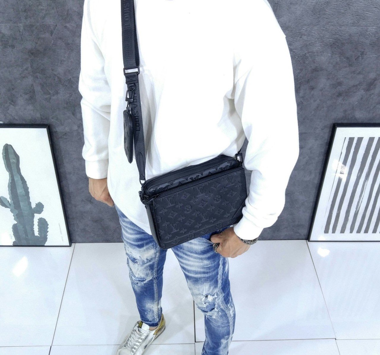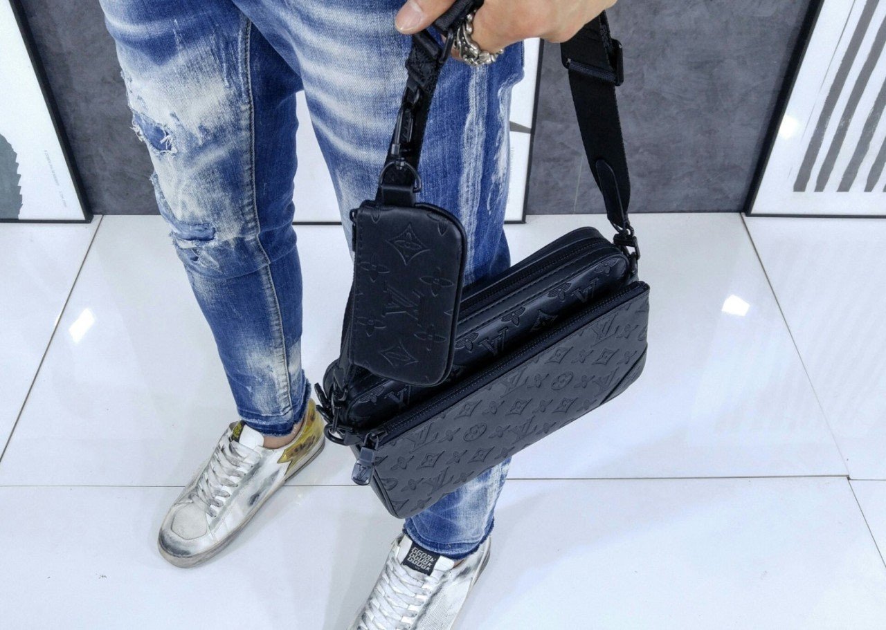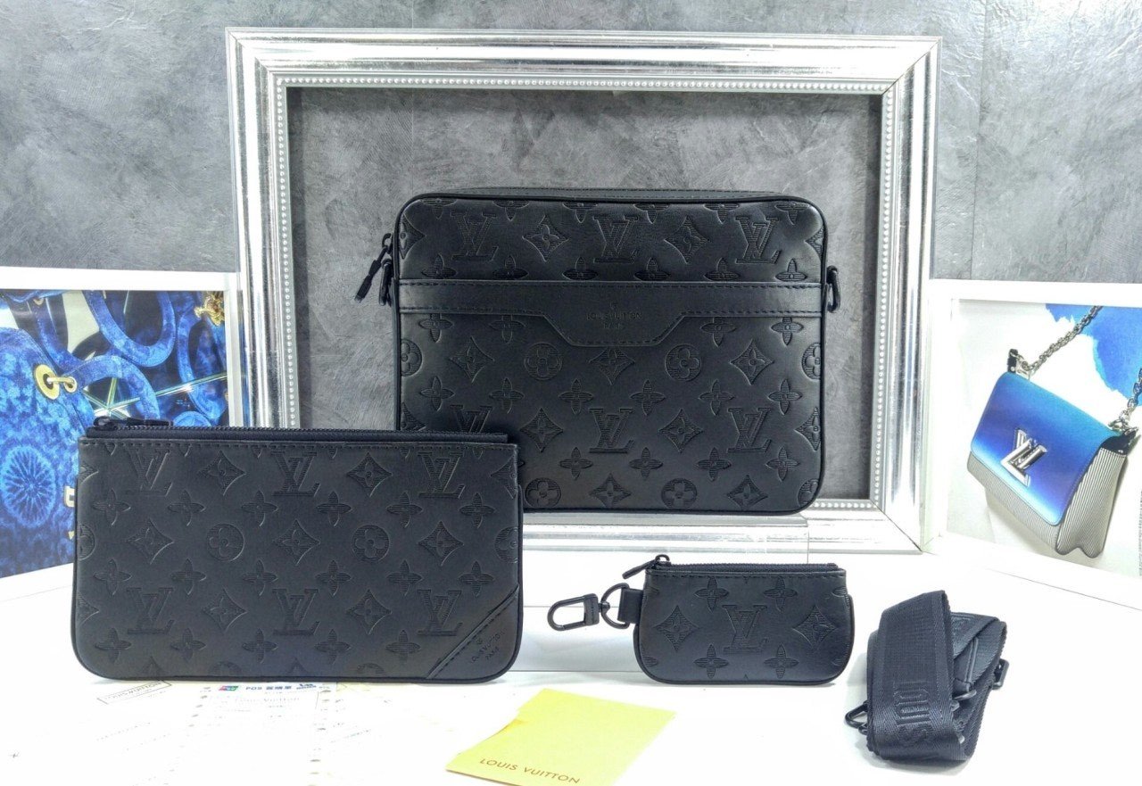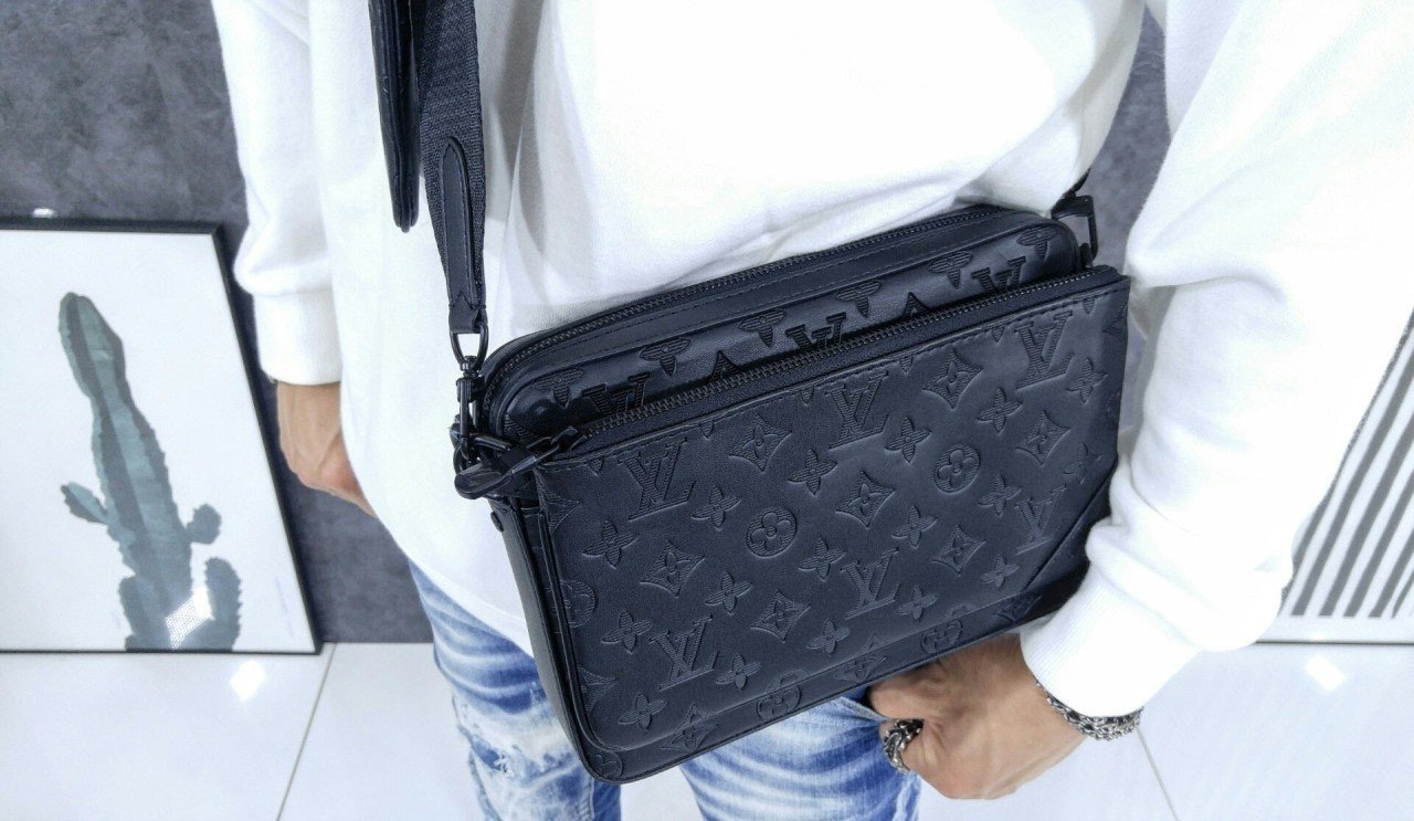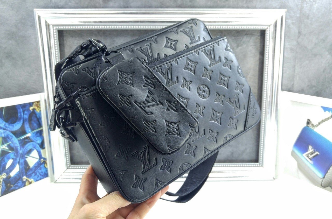 모노그램을 양각으로 새긴 송아지 가죽 소재의 트리오 메신저. 스타일리시한 하이브리드 백. 메인 수납 공간, 탈착 가능한 앞면 지퍼형 포켓과 스트랩에 달린 작은 탈착형 코인 퍼스가 특징. '루*'이 새겨진 자카드 텍스타일 소재의 조절 및 탈착 가능한 스트랩을 구성하여 크로스 바디 백 또는 숄더 백으로 연출할 수 있는 아이템.