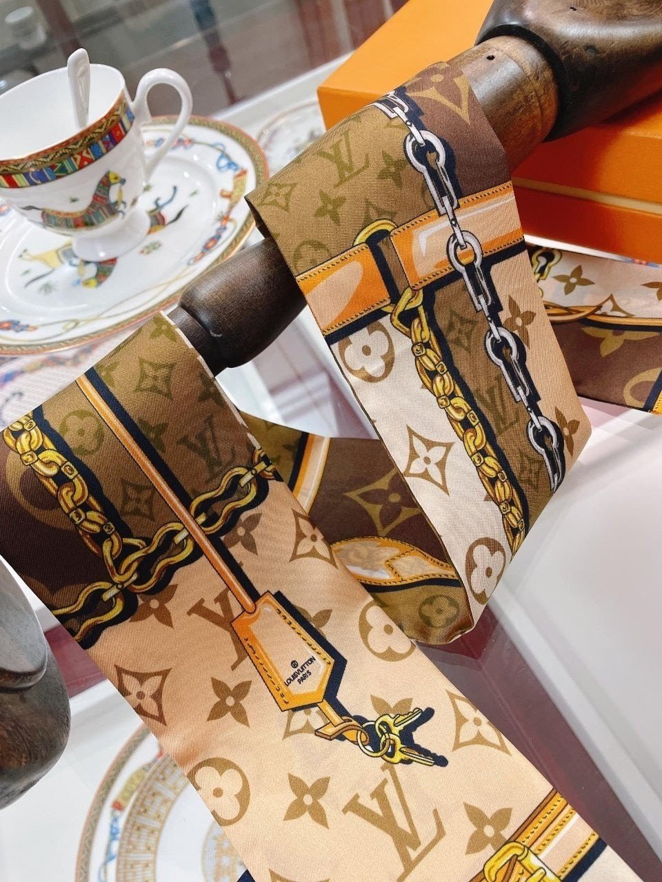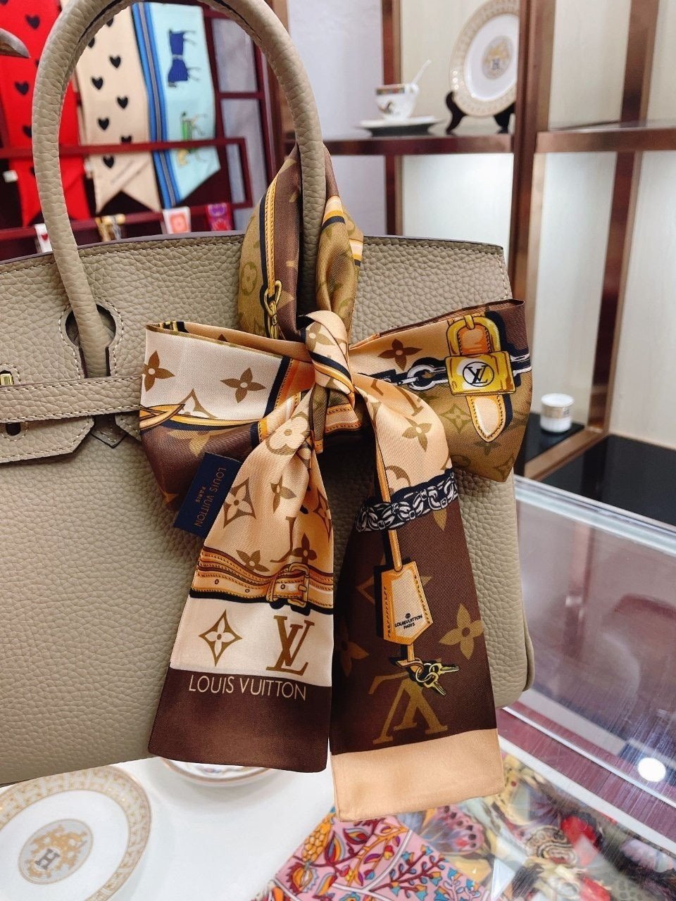 • 루* 모노그램 체리 패턴 브라운사각 스카프