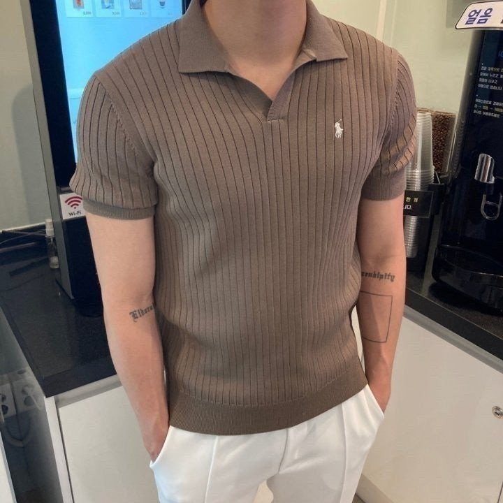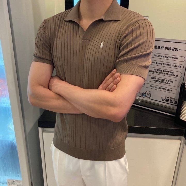 폴* 머슬핏 오픈카라 반팔니트 > 국내의류